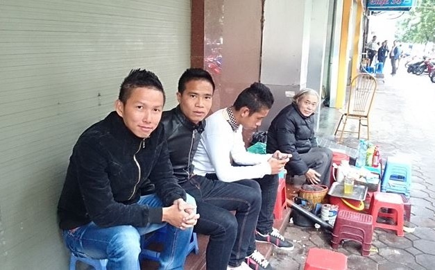 | Hoàng Thống cùng trợ lý ngôn ngữ Nguyễn Trí (trái) ngồi tại quán trà nóng trước cửa Đại sứ quán Anh. |
