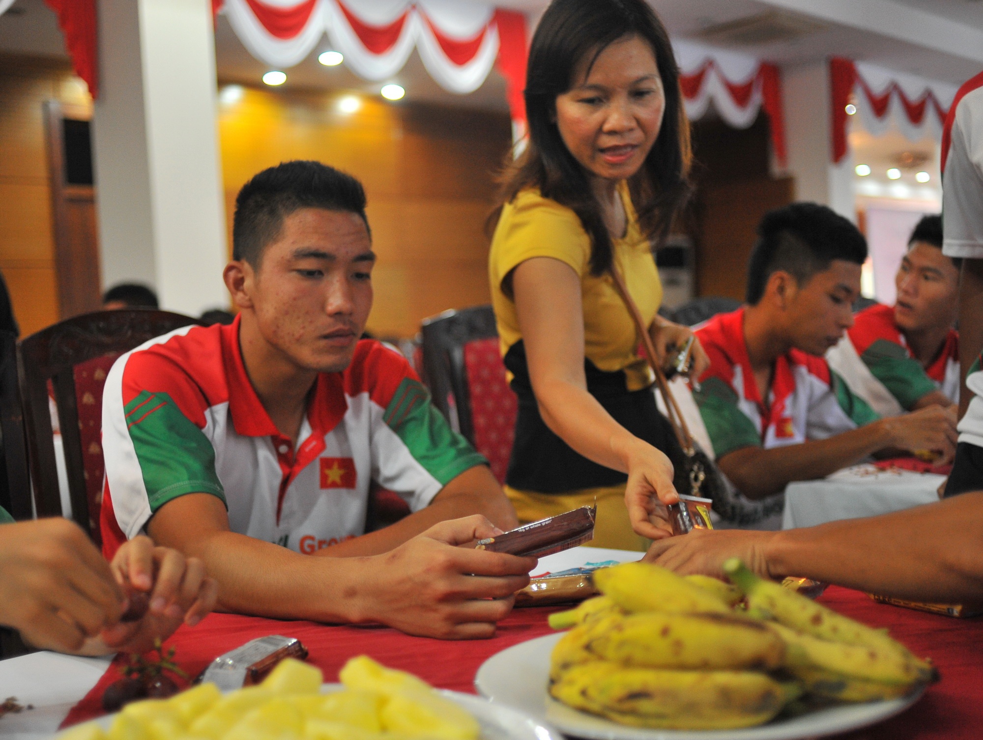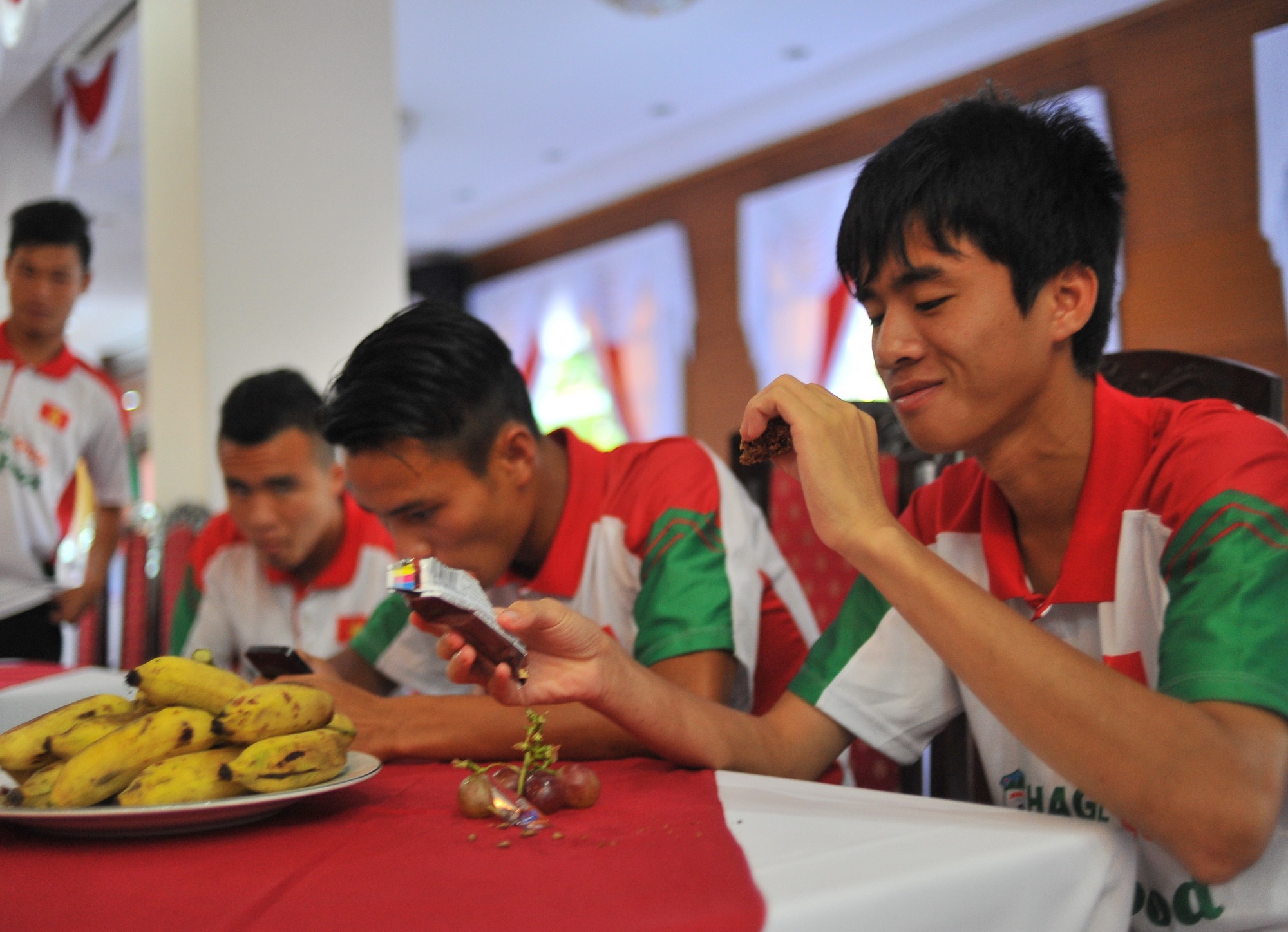 | Bữa ăn nhẹ của các cầu thủ U19 Việt Nam trước khi ra SVĐ Mỹ Đình tập luyện. |