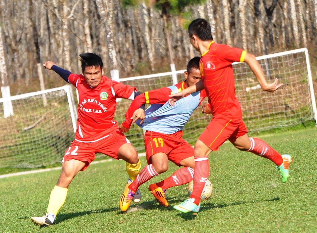| Tuy là buổi tập nội bộ nhưng các cầu thủ đã chơi rất tích cực, tranh bóng quyết liệt. |