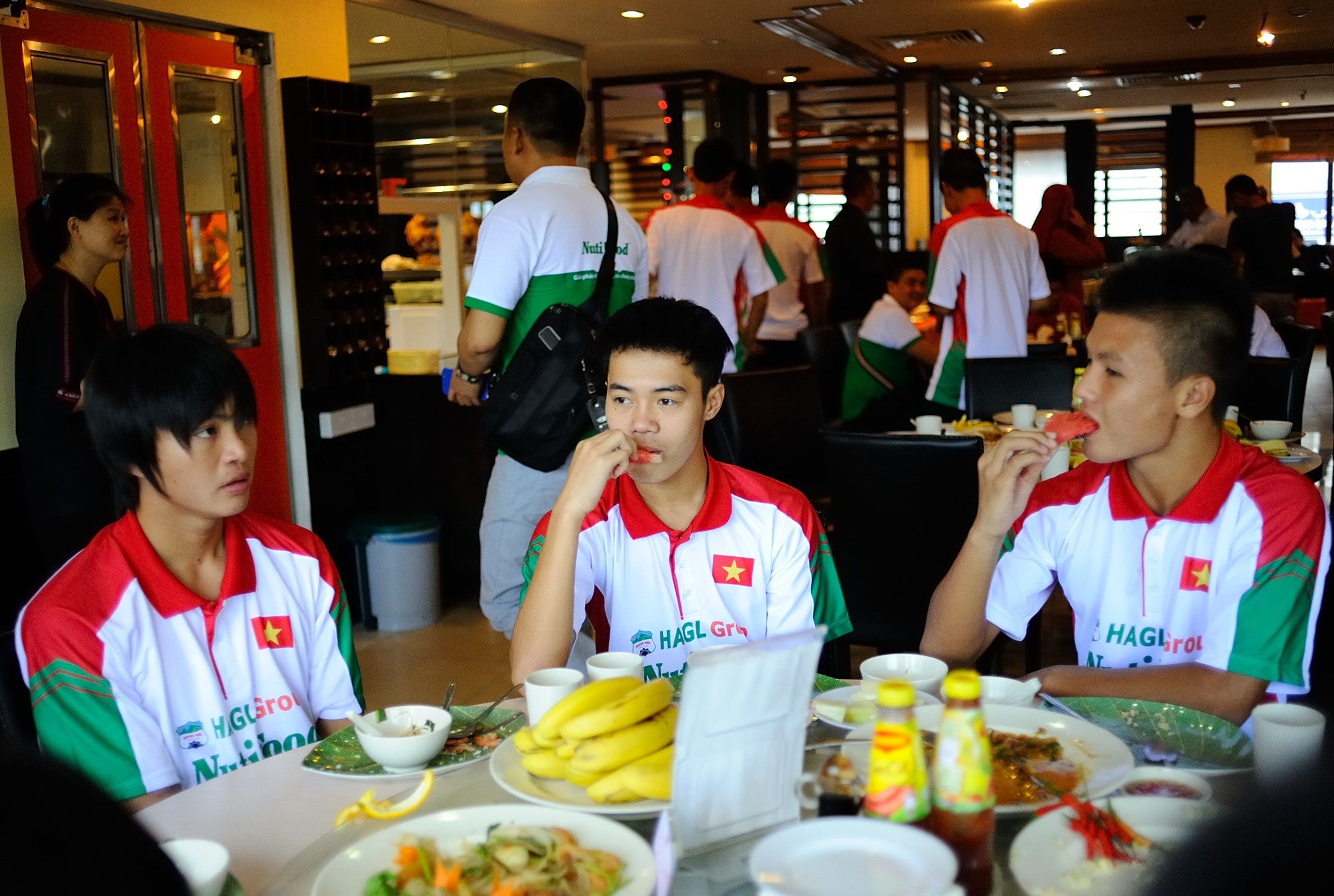 | Bữa ăn đầu tiên của U19 Việt Nam tại Brunei sau chặng đường dài di chuyển rất mệt mỏi. |