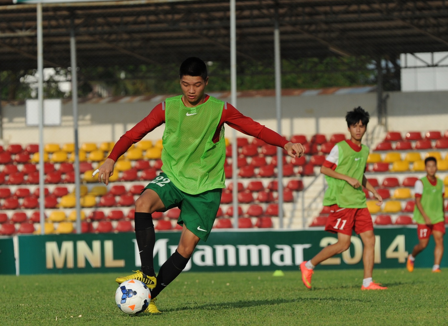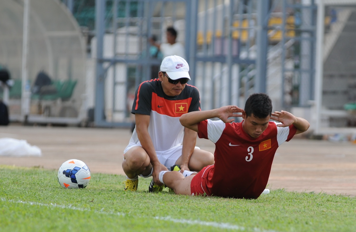 | Trong khi các đồng đội rèn chiến thuật thì Đông Triều phải tập riêng ở bên lề sân cỏ. |