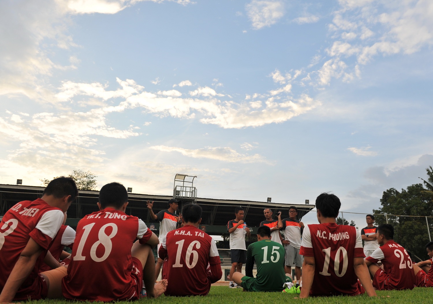 | Đội hình chính (áo đỏ), thi đấu với cặp trung vệ Tiến Dũng và Lục Xuân Hưng thay cho vị trí của Đông Triều bị chấn thương. |
