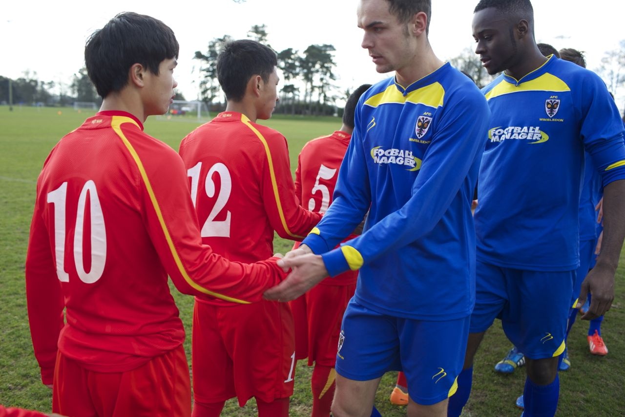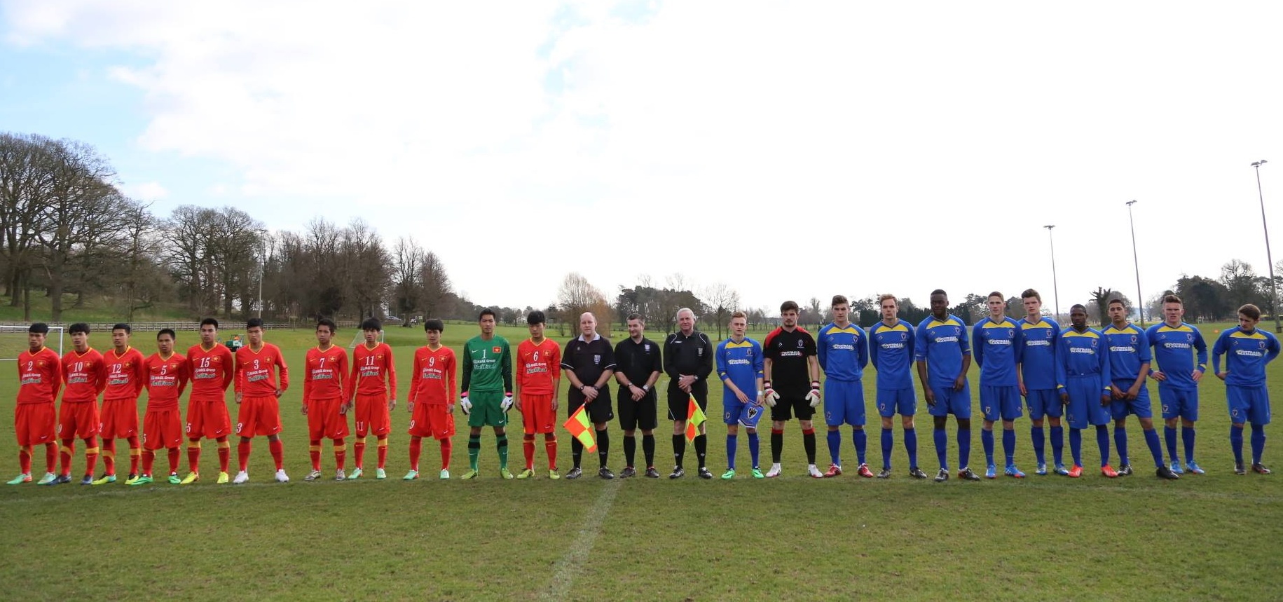 | Đội hình ra sân của U18 Wimbledon với phần lớn cầu thủ cao vượt trội, áp đảo đội hình nhỏ con của U19 Việt Nam. |