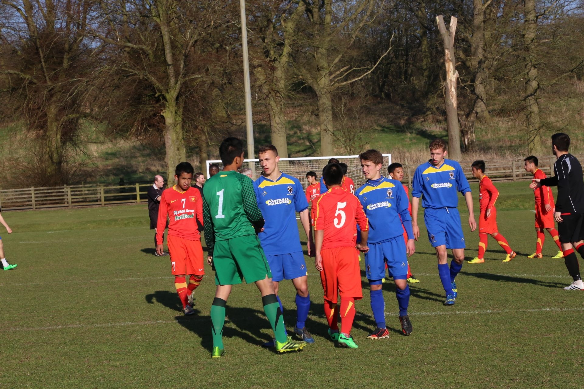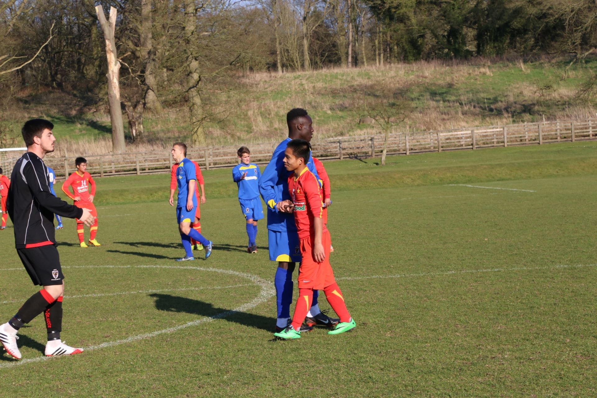 | Trung vệ Văn Quý của U19 Việt Nam chỉ đứng đến ngang vai tiền đạo mang áo số 17 bên phía U18 Wimbledon. |
