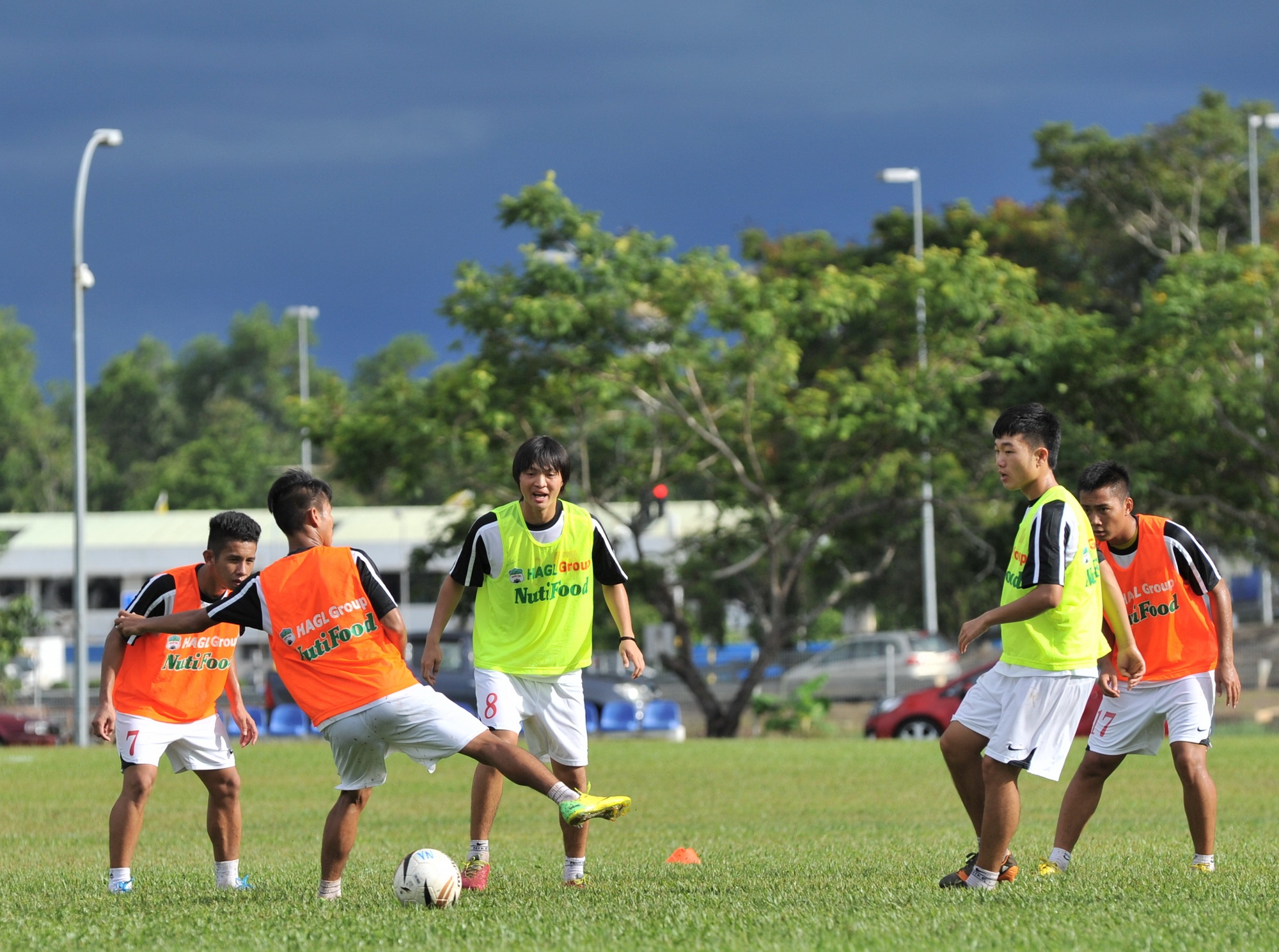 | Tiền đạo Văn Toàn (số 9), trung vệ Lục Xuân Hưng (5), cùng hậu vệ Ksor Úc (phía sau) đều sẽ được đá chính trong trận đấu ngày mai. |