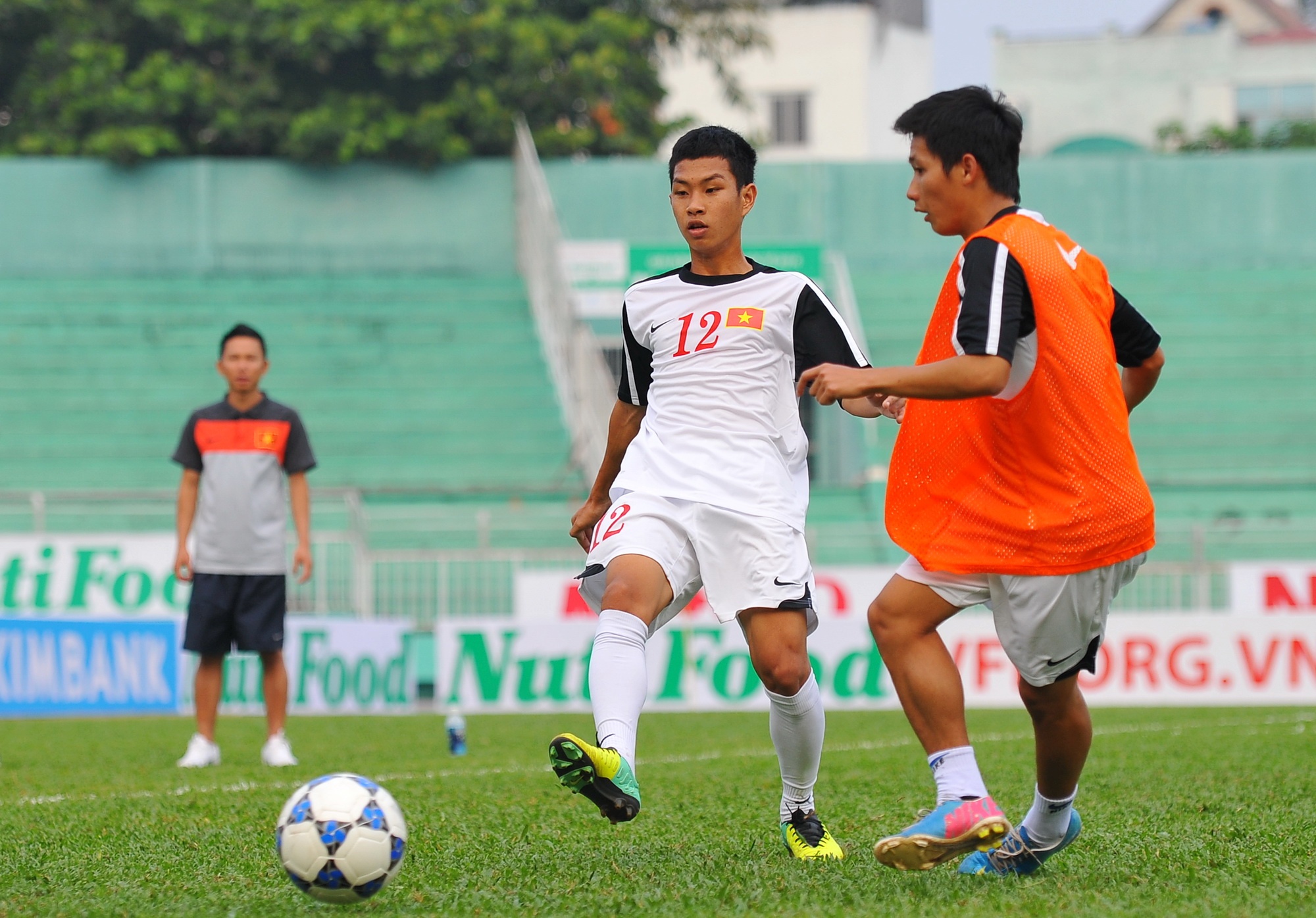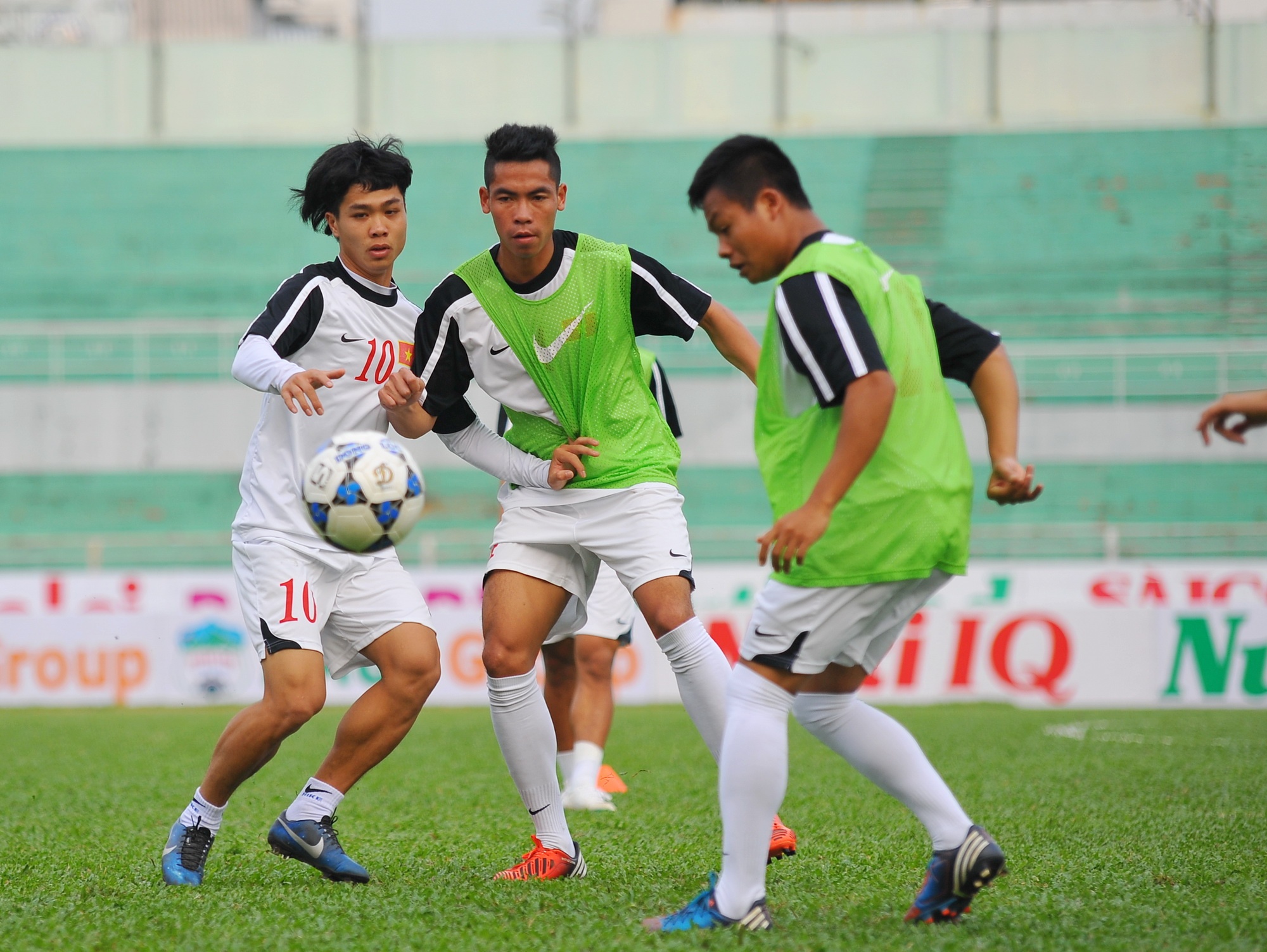 | Các cầu thủ U19 Việt Nam sẽ gặp nhiều thử thách tại giải đấu U19 quốc tế lần này. Trong ảnh, Công Phượng (số 10) tập tranh chấp bóng với một đồng đội to cao. Bài tập nhằm giúp các cầu thủ có sự chuẩn bị tốt nhất trước trận đấu với những đối thủ vượt trội về tầm vóc. |