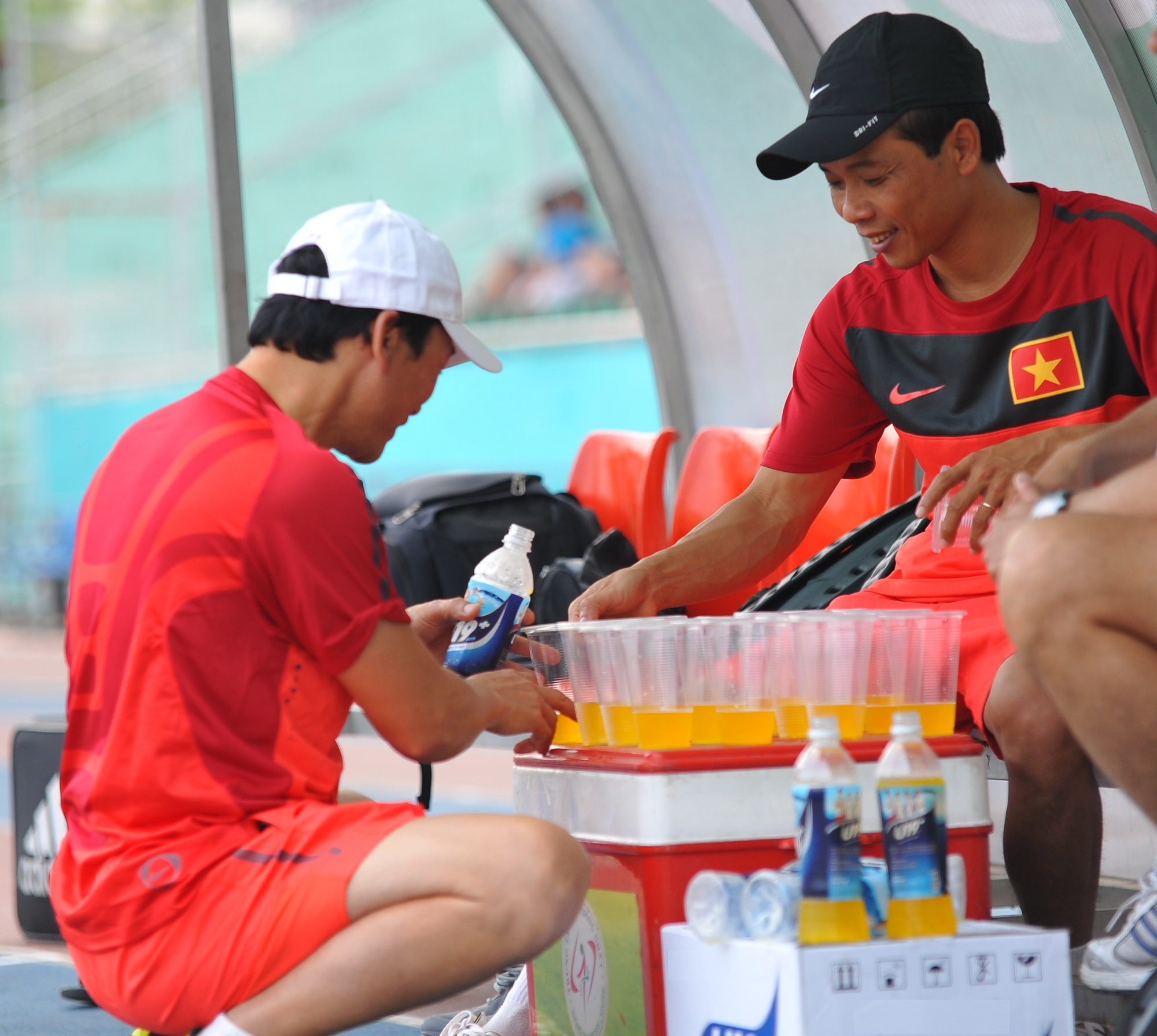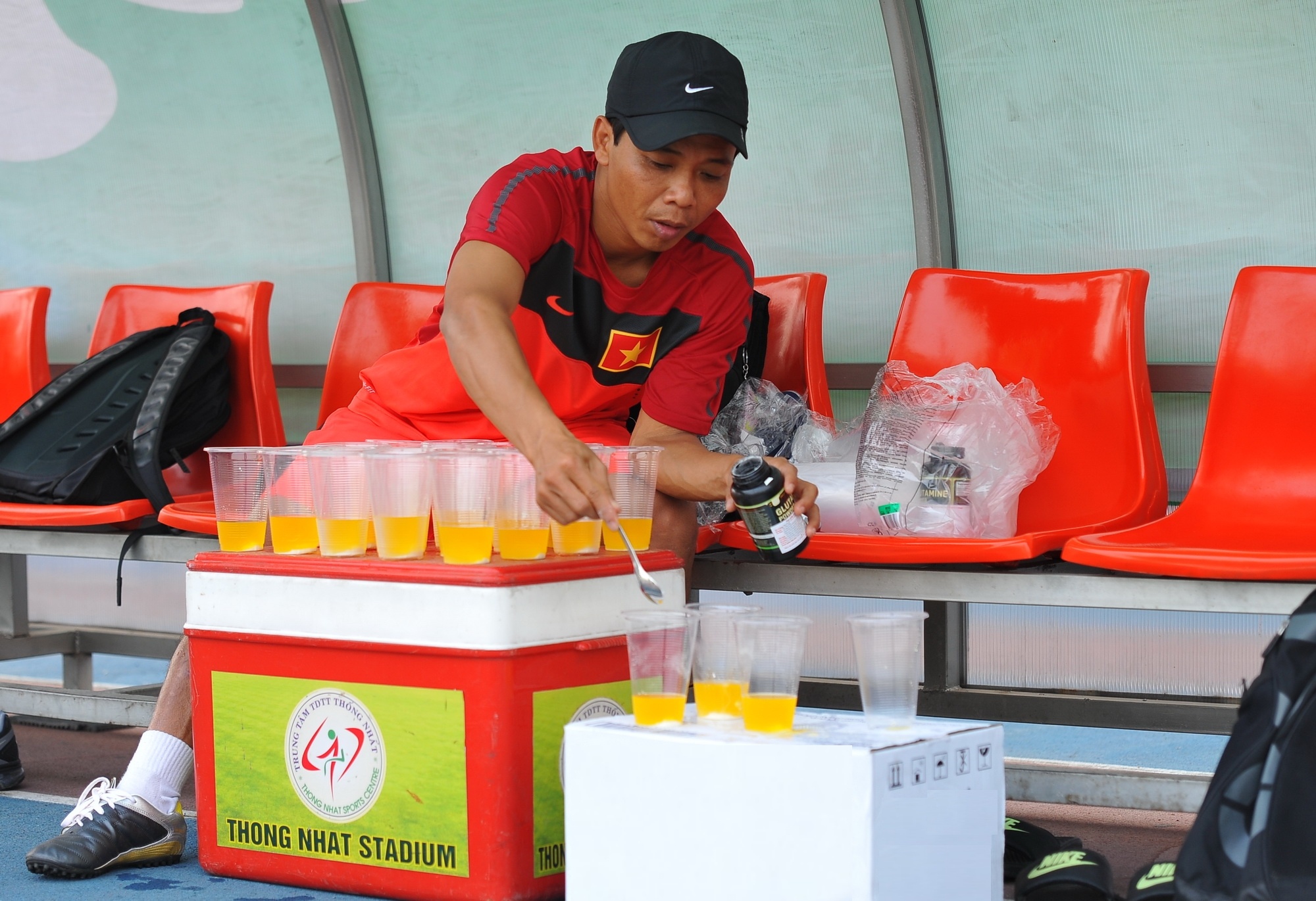 | Bác sĩ của đội tuyển U19 Việt Nam tự tay pha chế nước uống trong buổi tập cho các cầu thủ. |
