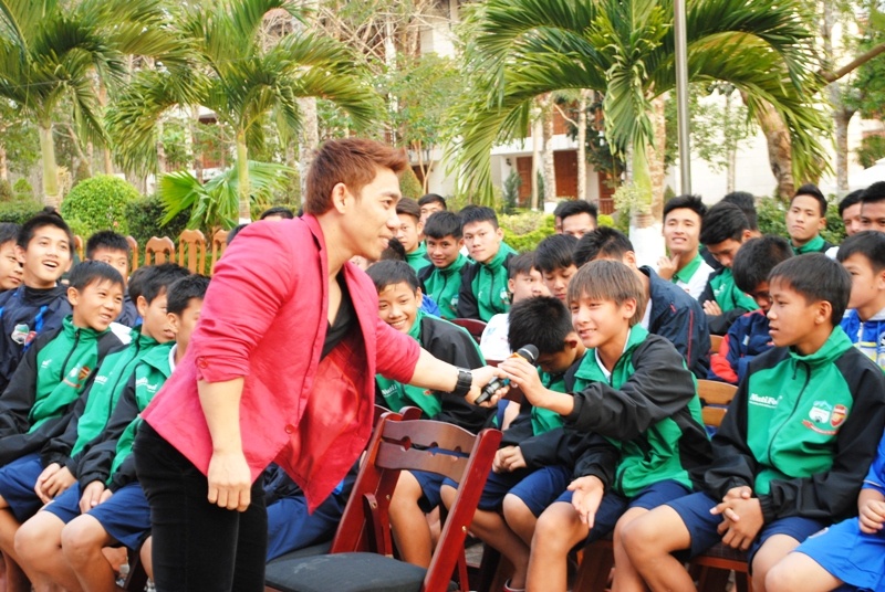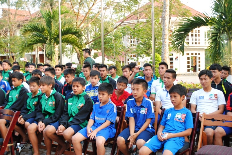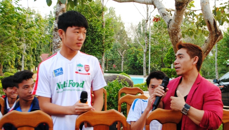 | Chiều 16/2, Phạm Văn Mách cùng đối tác dinh dưỡng của học viện HAGL-Arsenal JMG nói chuyện để tư vấn cho các cầu thủ về việc chăm sóc bản thân, rèn luyện sức khỏe để có một cơ thể cường tráng, khỏe mạnh giống như Mách. |