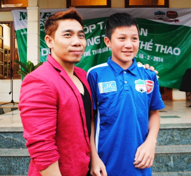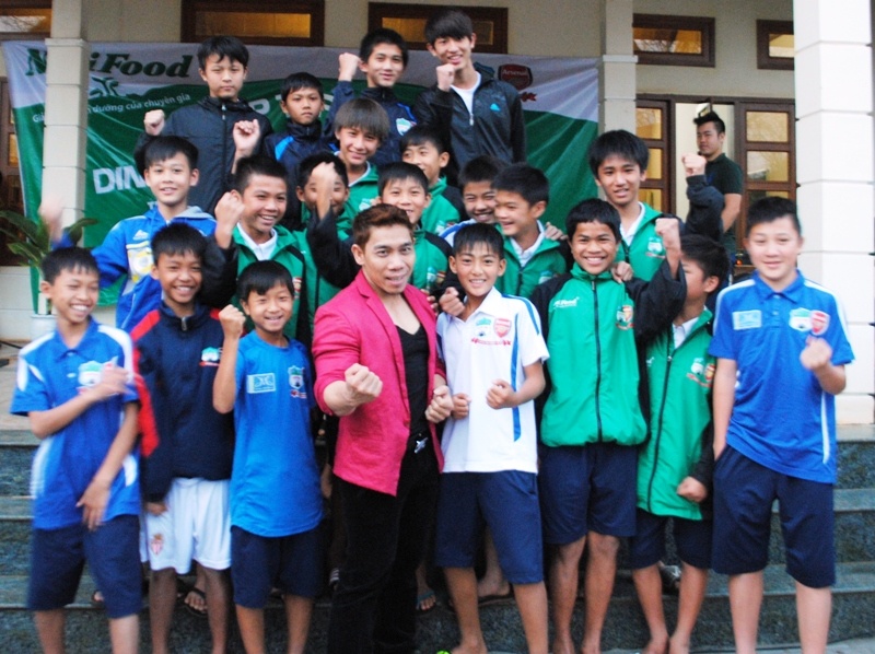 | Cầu thủ khóa III của học viện HAGL-Arsenal JMG chụp ảnh cùng Mách. |