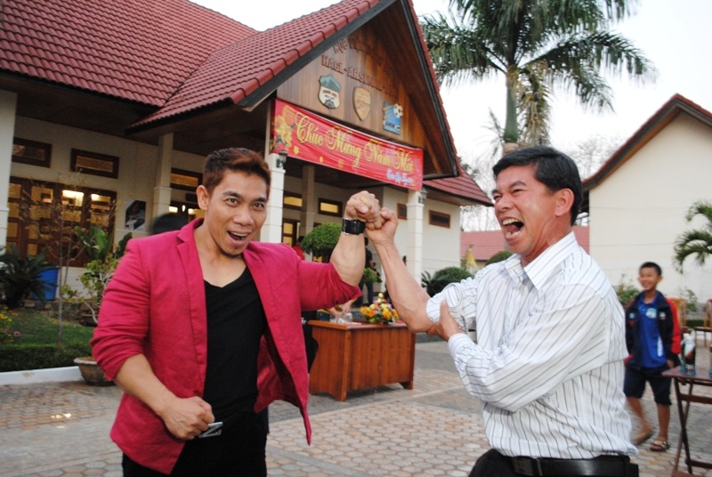 | Giám đốc điều hành CLB HAGL Huỳnh Mau cũng hào hứng so hình thể với Mách. |