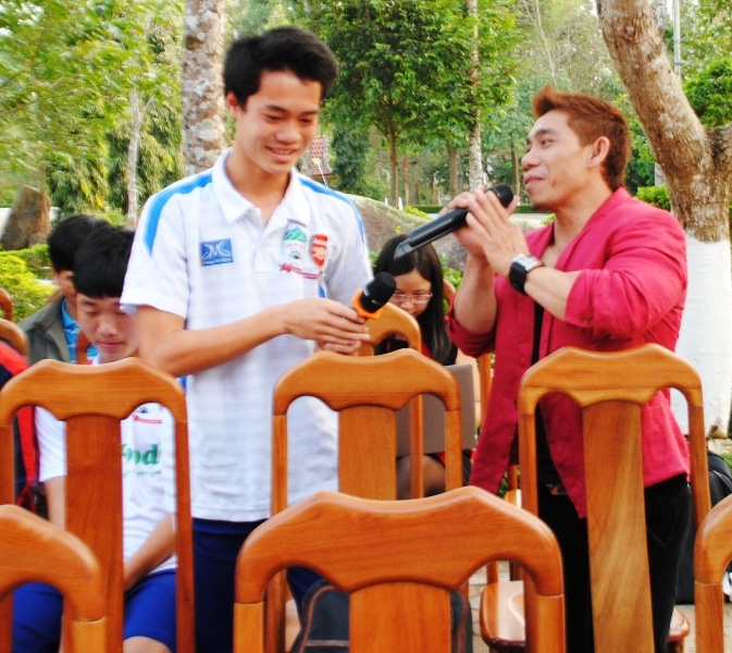 | Lương Xuân Trường khá ngập ngừng khi giao lưu cùng lực sĩ VN. |