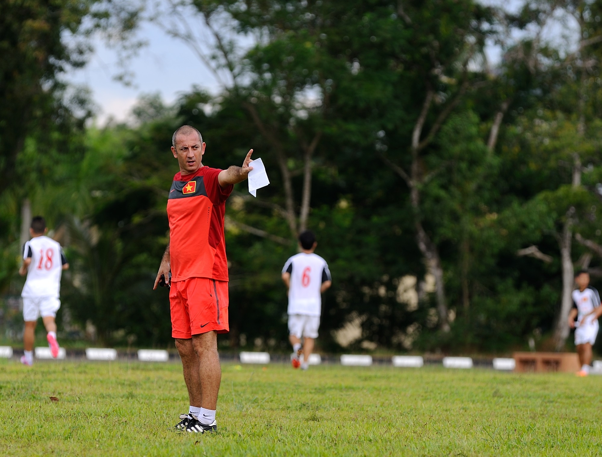 | HLV Guillaume Graechen đã xin nghỉ buổi họp báo kỹ thuật trước giải U22 ĐNA và cử trợ lý ngôn ngữ Nguyễn Hữu Trí tới dự thay để trực tiếp chỉ đạo buổi tập đầu tiên của U19 Việt Nam trên đất Brunei. |