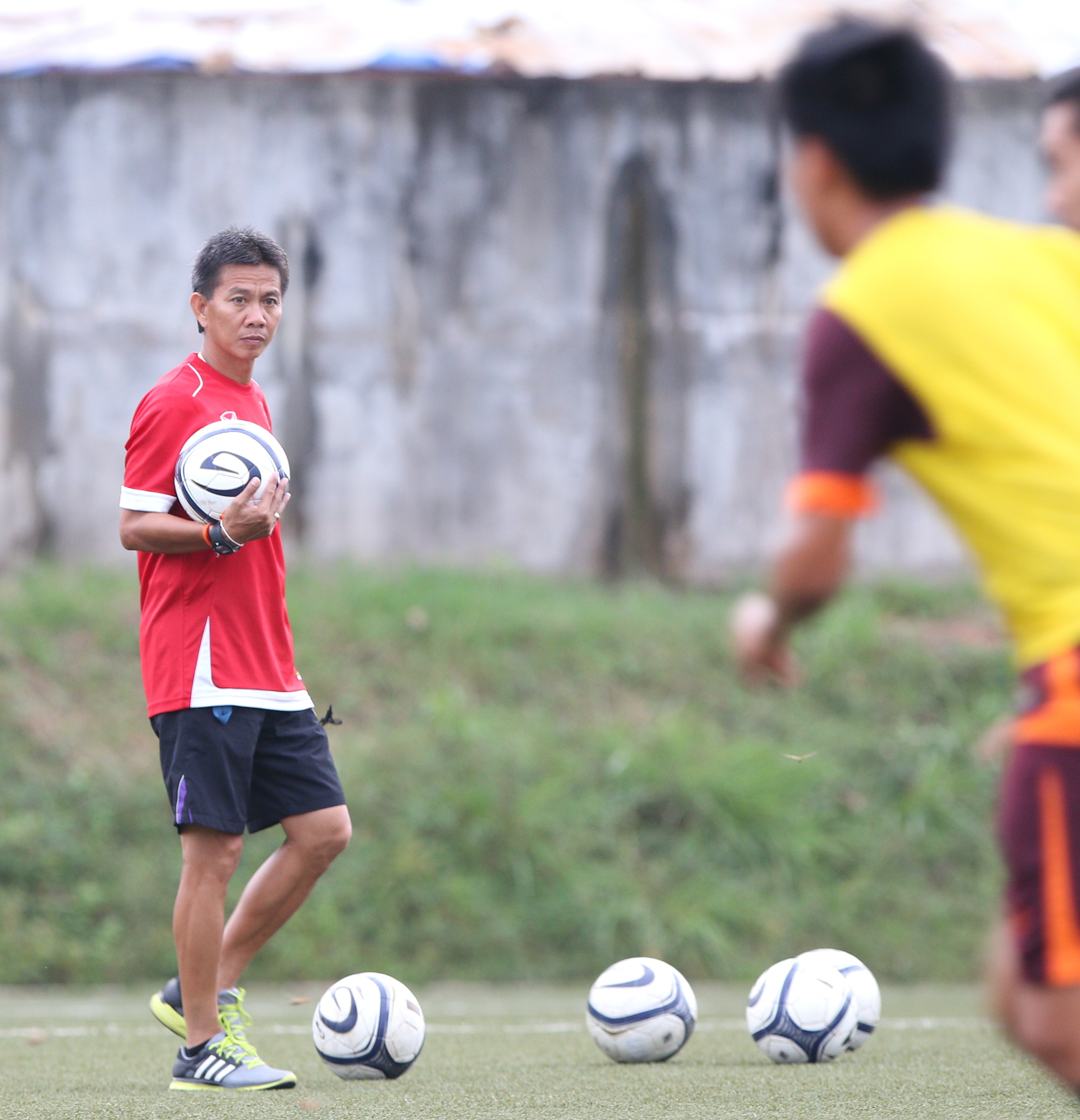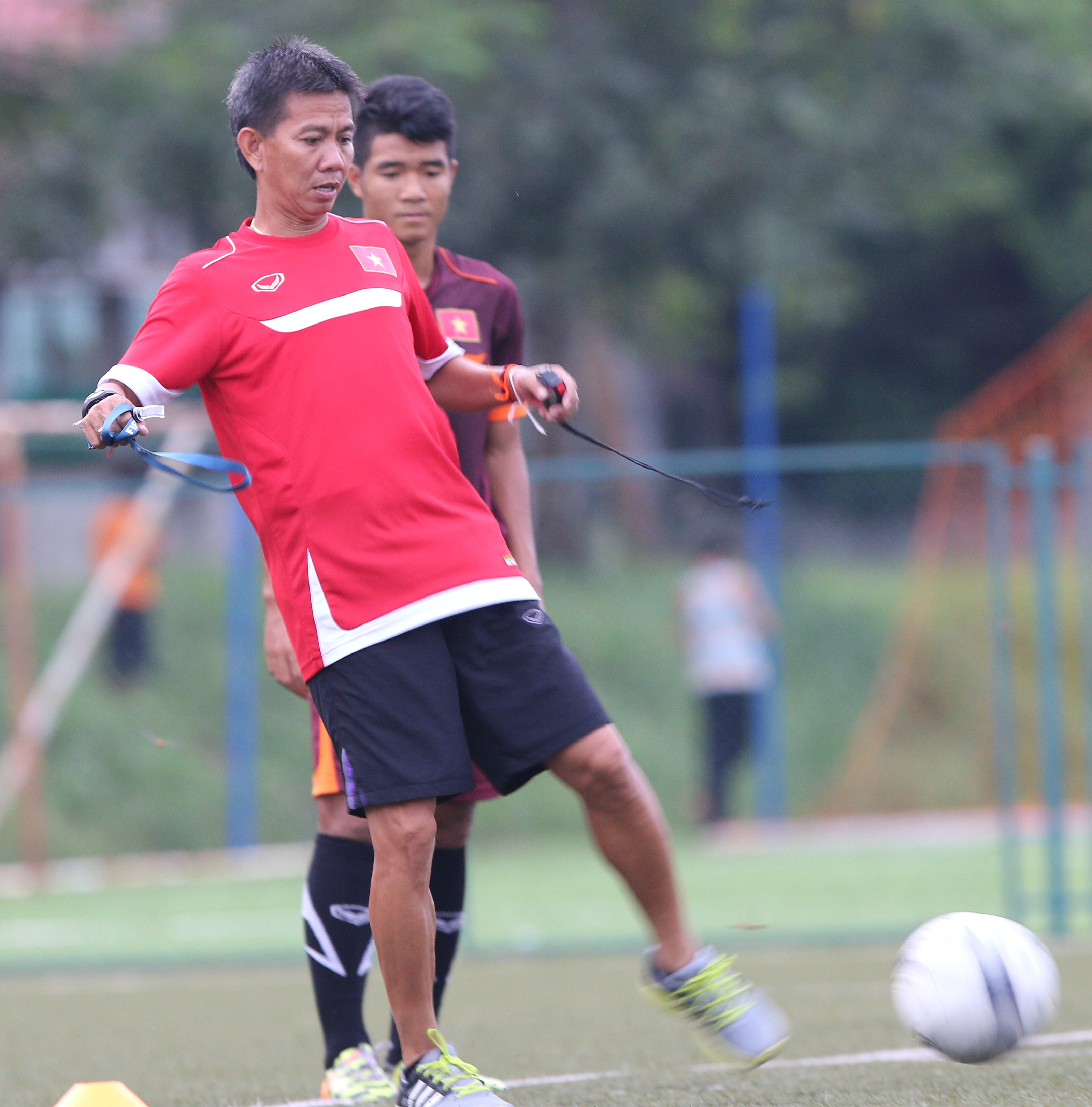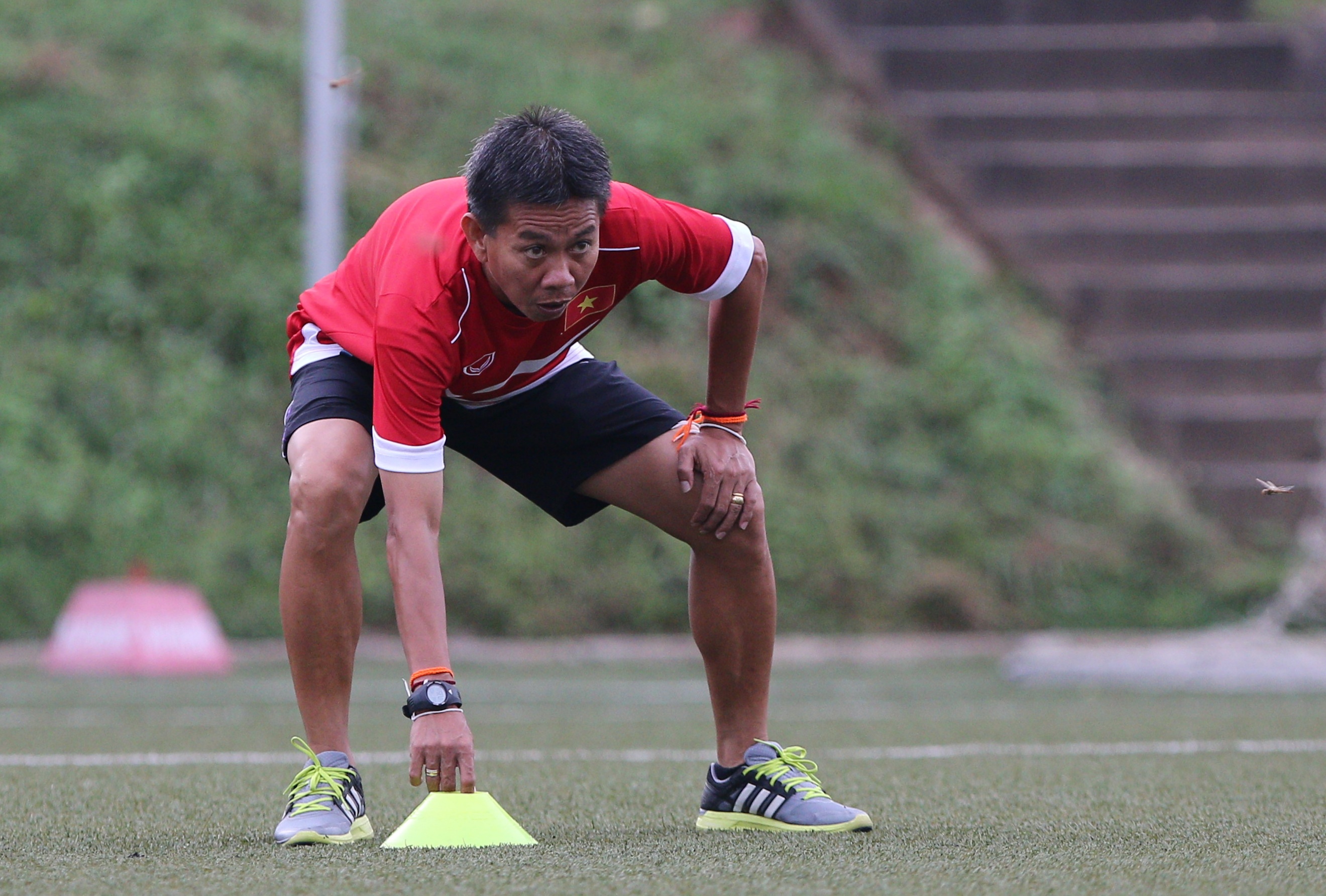 | Trong khi các cầu thủ căng cơ khởi động, HLV Hoàng Anh Tuấn tỉ mỉ sắp xếp dụng cụ tập luyện cho học trò. |