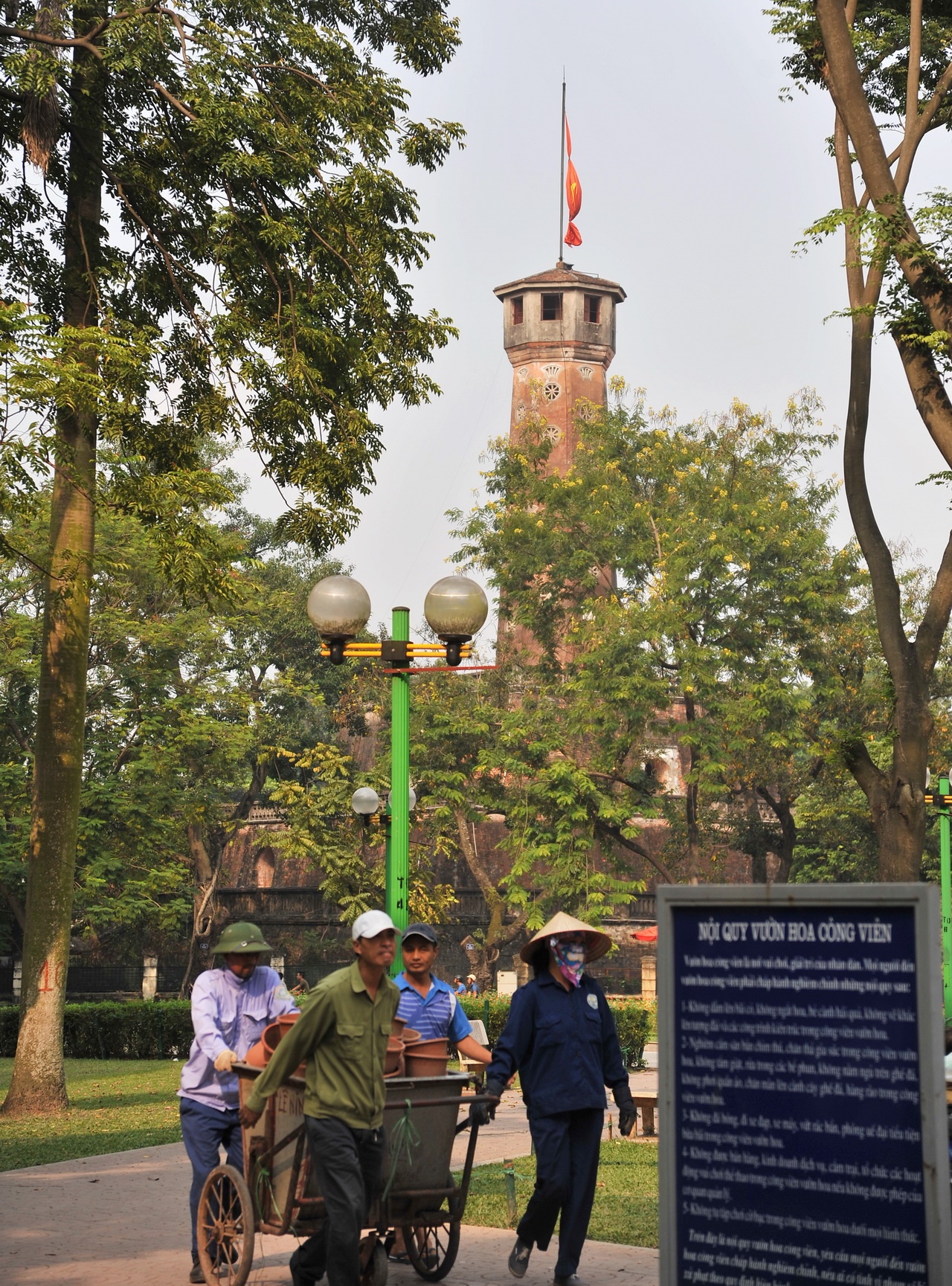 | Quang cảnh treo cờ rủ tại cột cờ Hà Nội, một trong những điểm mà các cầu thủ U19 Việt Nam tham quan. |