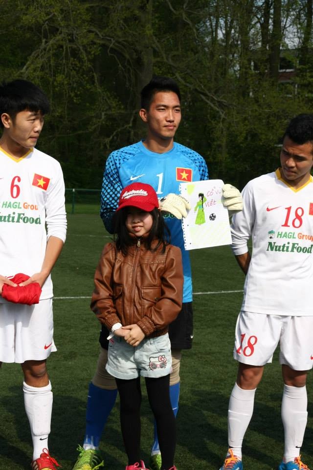 | Thủ môn Lê Văn Trường nhận được món quà ngộ nghĩnh từ fan nhí dễ thương. |