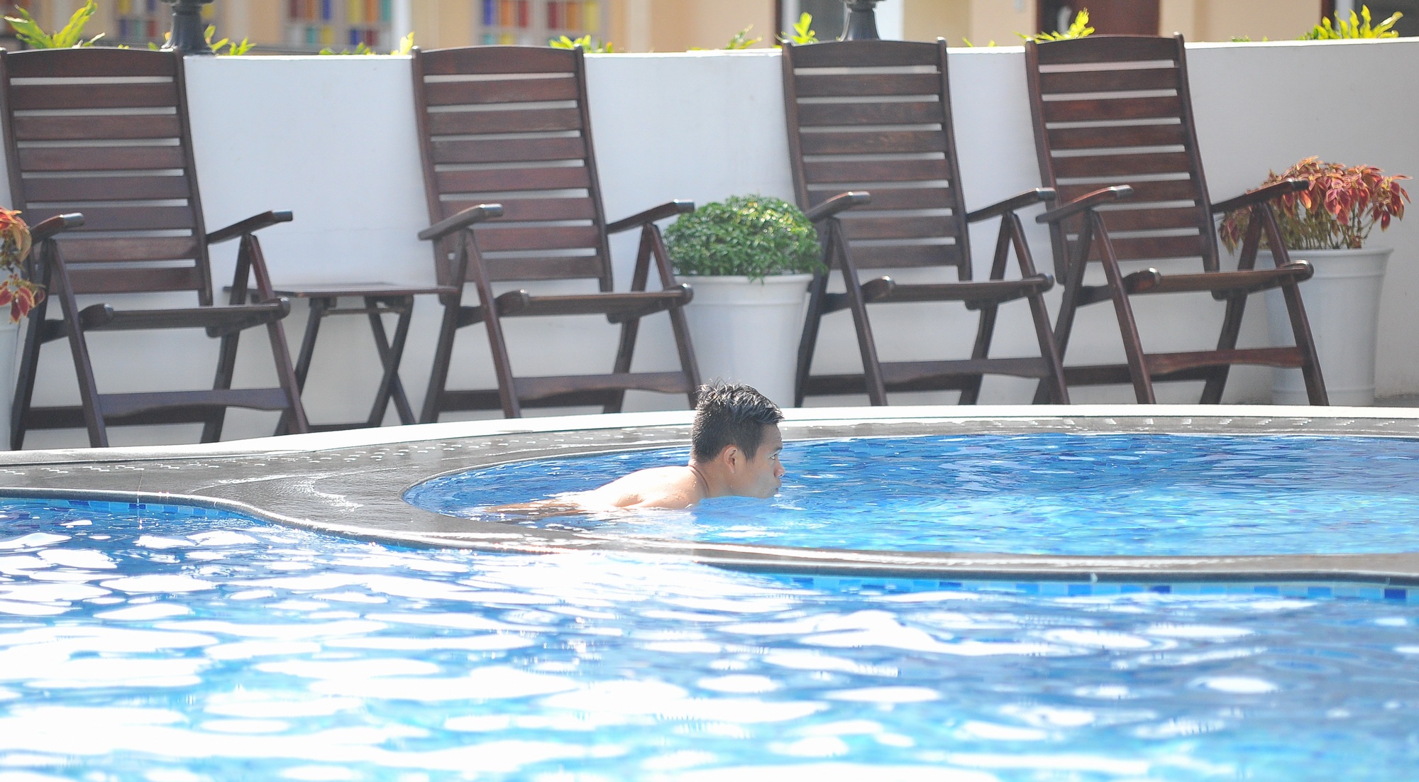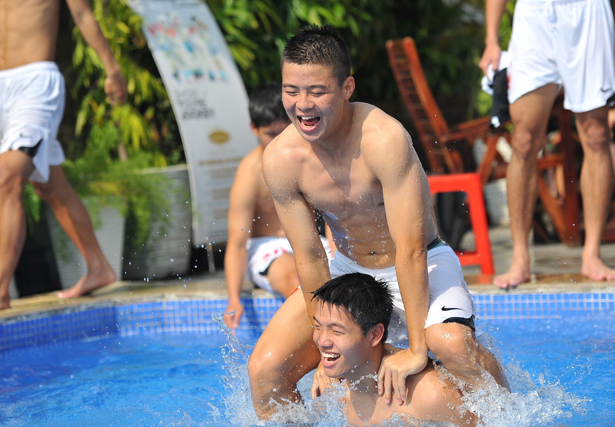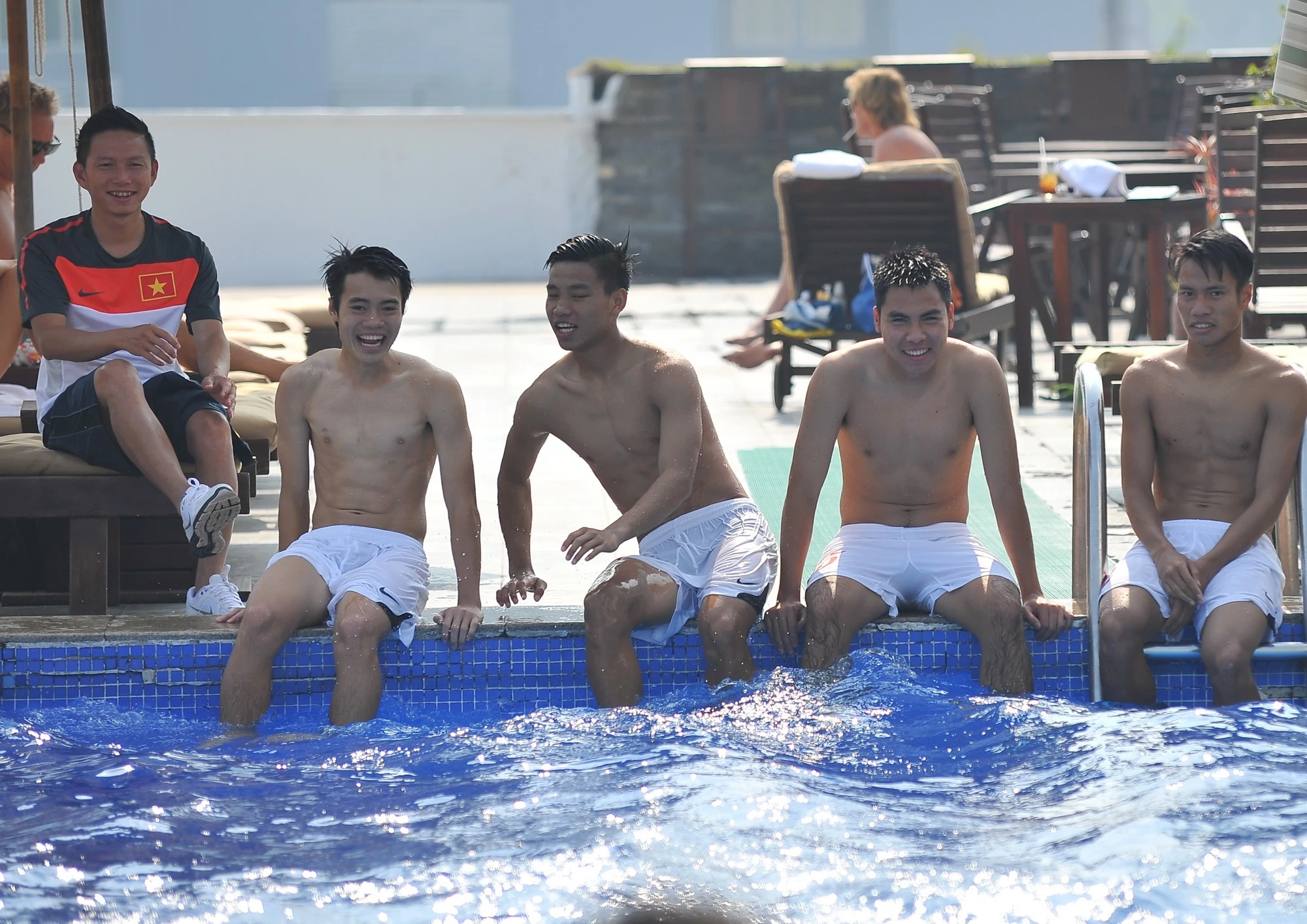 | Các cầu thủ thả lỏng bên bể bơi khoảng 1 tiếng, sau đó về lại phòng nghỉ ngơi để chuẩn bị cho buổi tập vào lúc 16h30 chiều nay. |