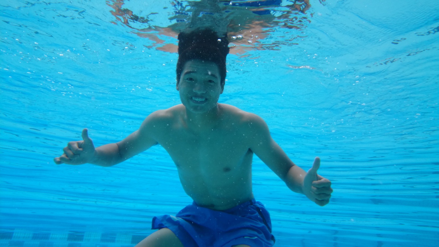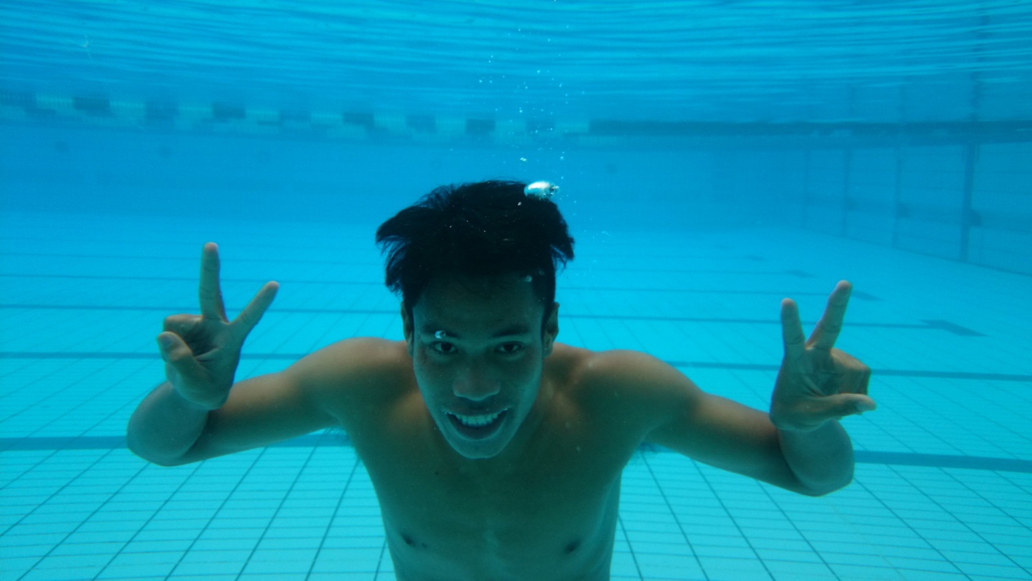 | Công Phượng mệt phờ khi hoàn thành chặng bơi dọc bể có chiều dài 50 m. |