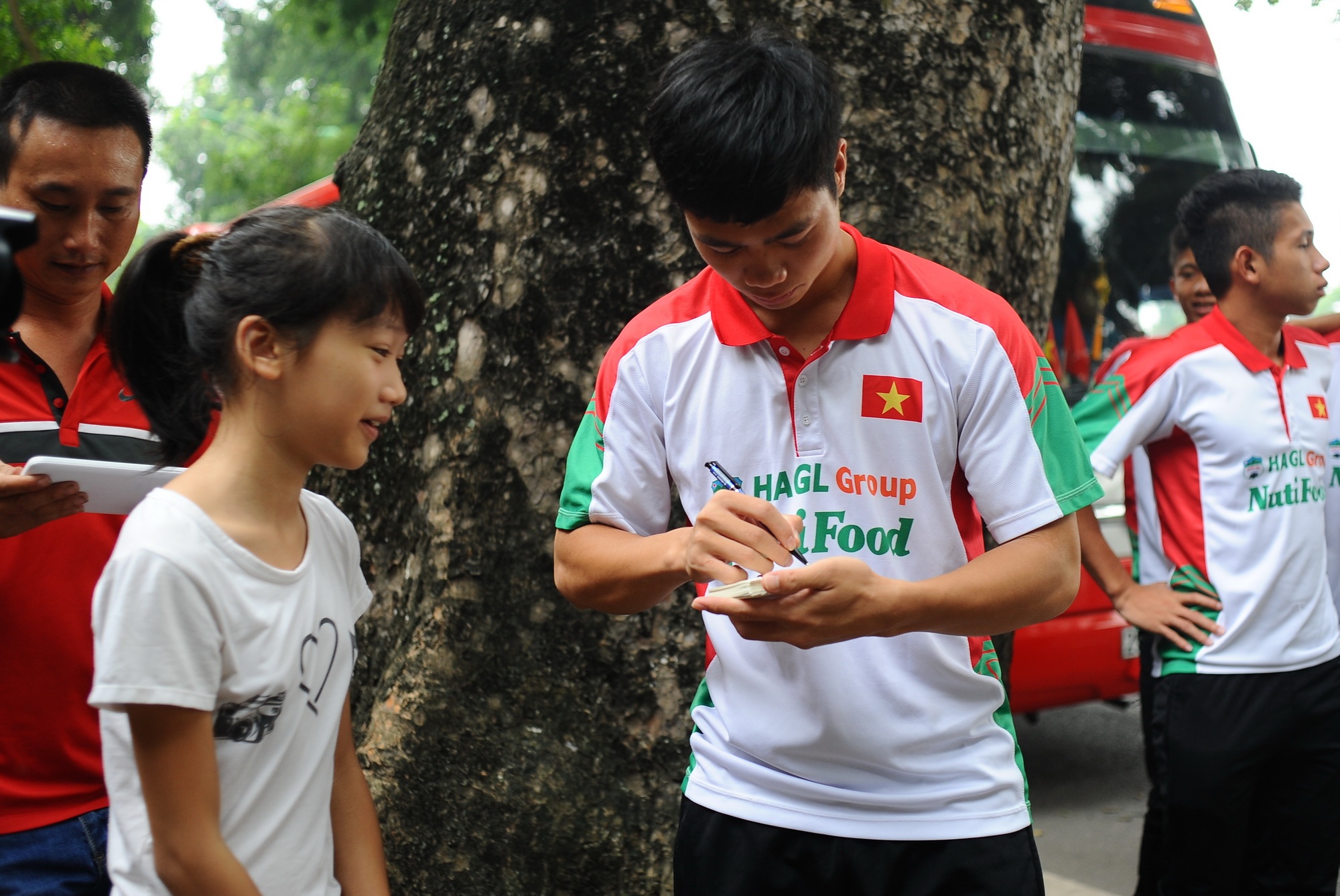 | Em nhỏ may mắn khi xin được chữ ký cuối cùng của Công Phượng trước khi cả đoàn U19 Việt Nam vào phía trong khuôn viên nhà Đại tướng. |