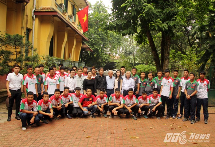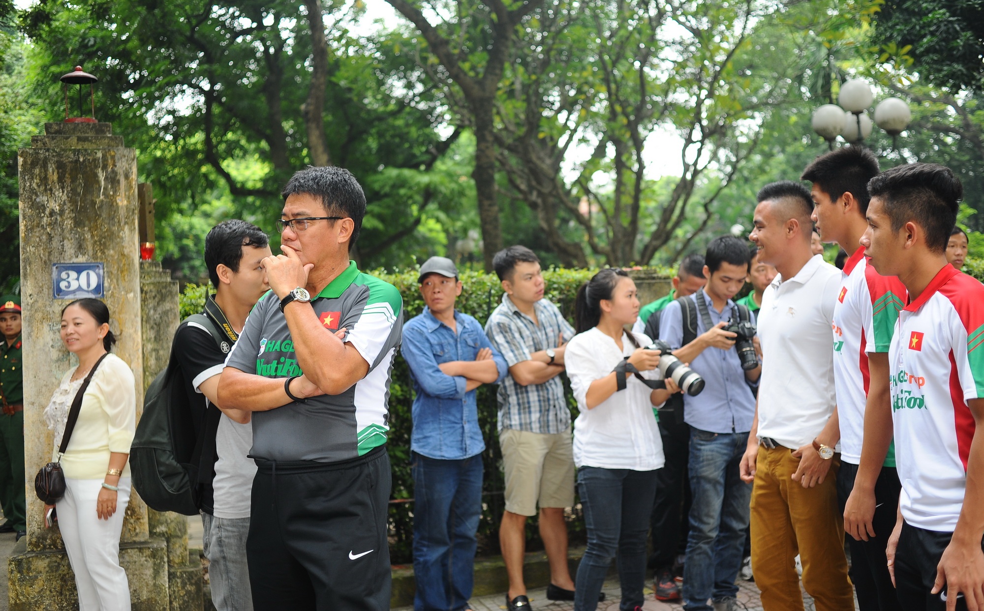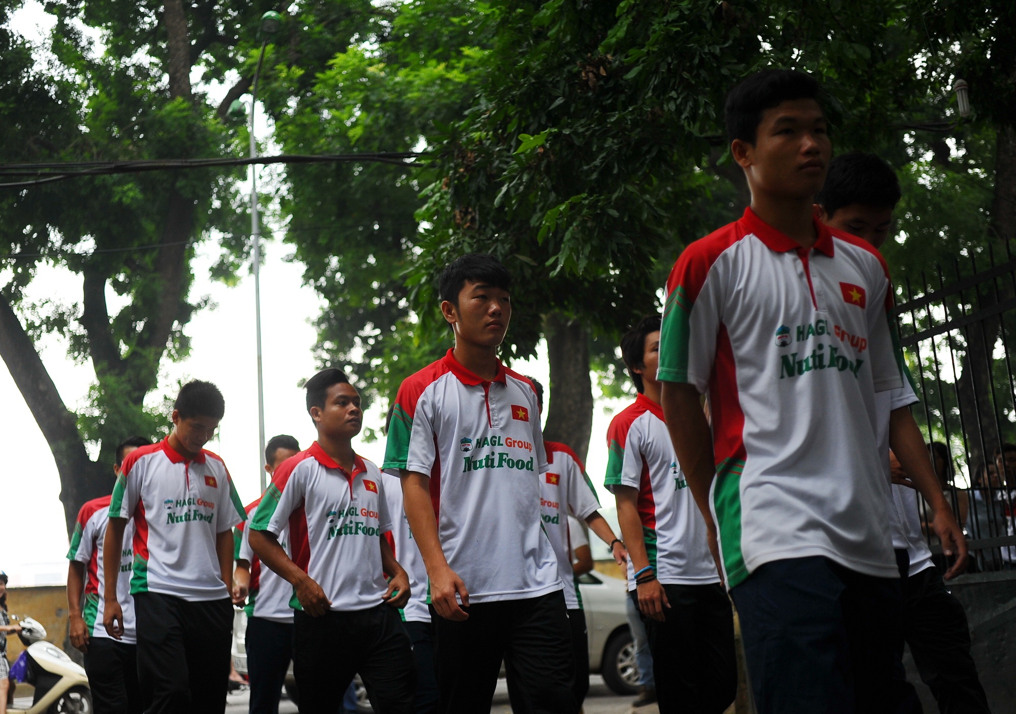 | Trường đoàn Dương Vũ Lâm cùng toàn thể các cầu thủ U19 Việt Nam bị người hâm mộ vây quanh khi đang xếp hàng trước cửa nhà Đại tướng tại số 30 đường Hoàng Diệu. |