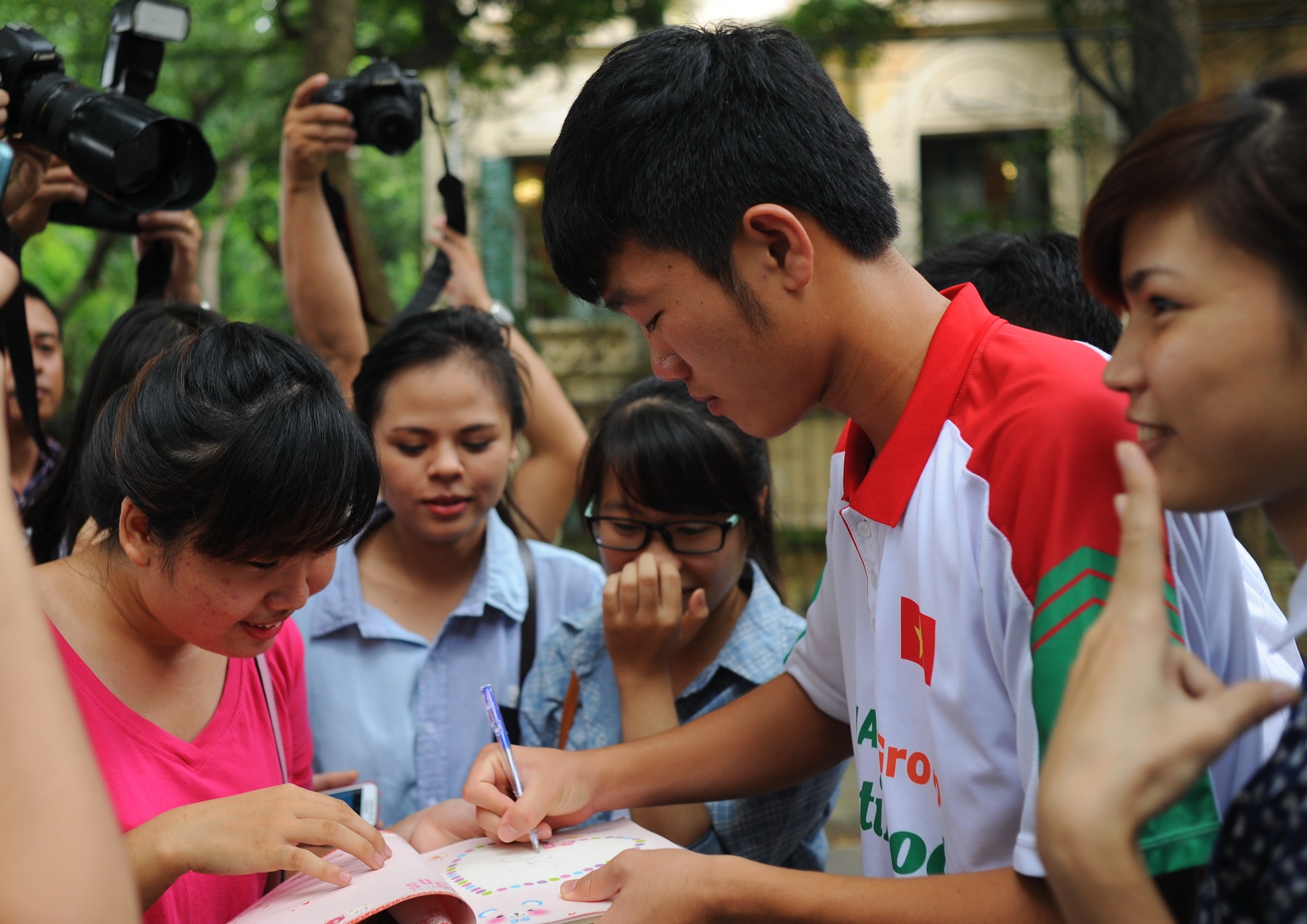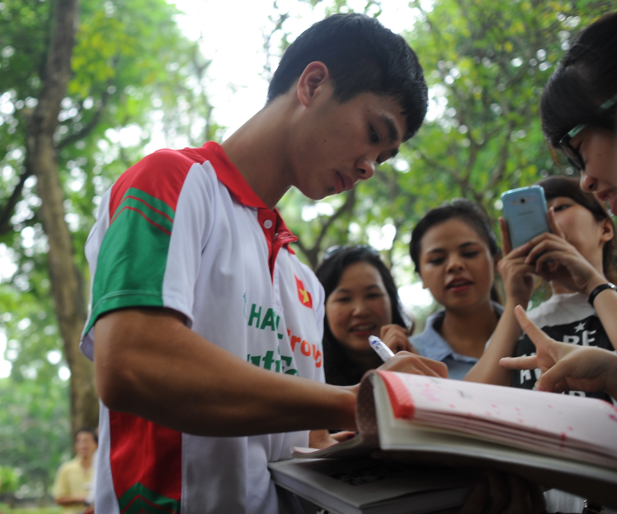 | Xuân Trường bị các fan nữ quây kín để xin chữ ký và chụp ảnh cùng. |