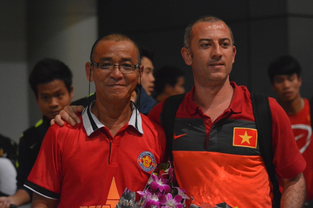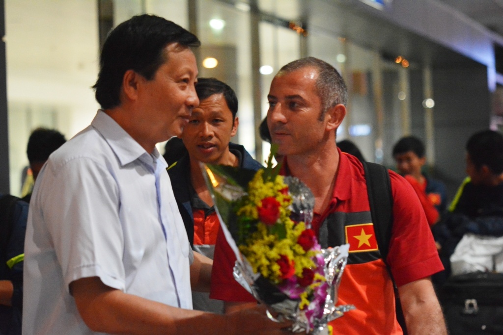 | Đại diện LĐBĐ Việt Nam chào mừng HLV Guillaume Graechen cùng các học trò trở về. |