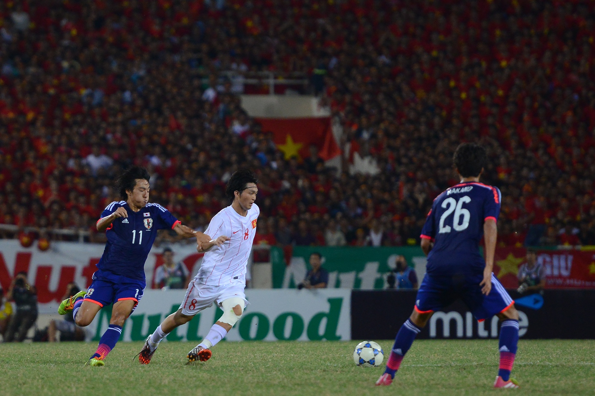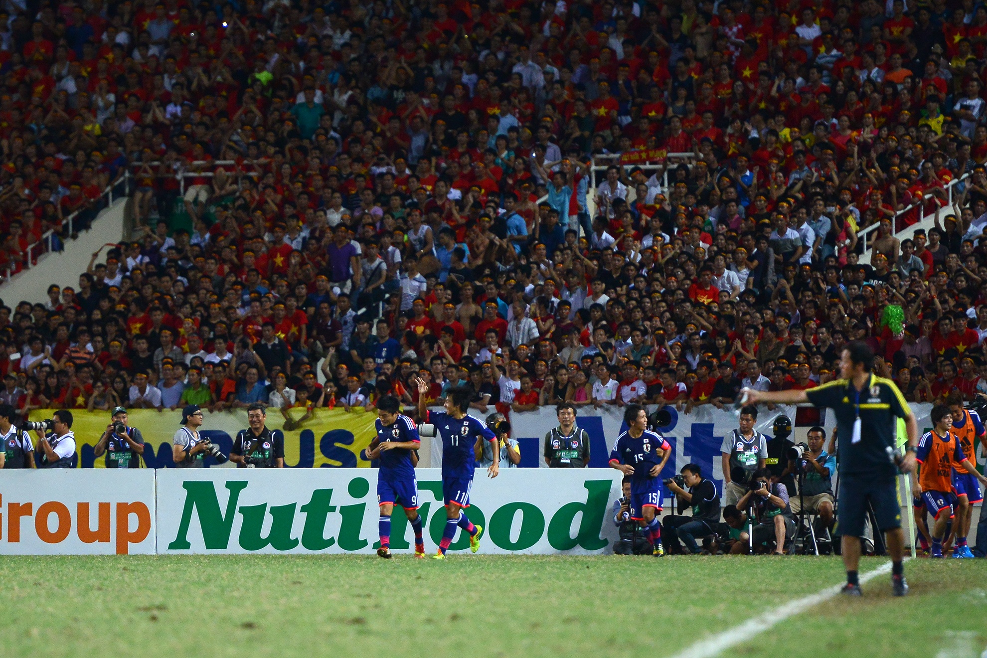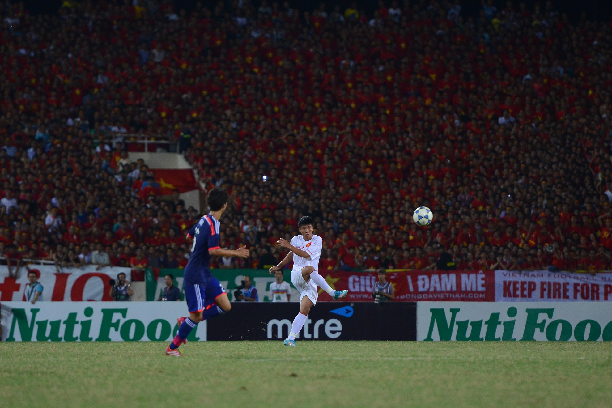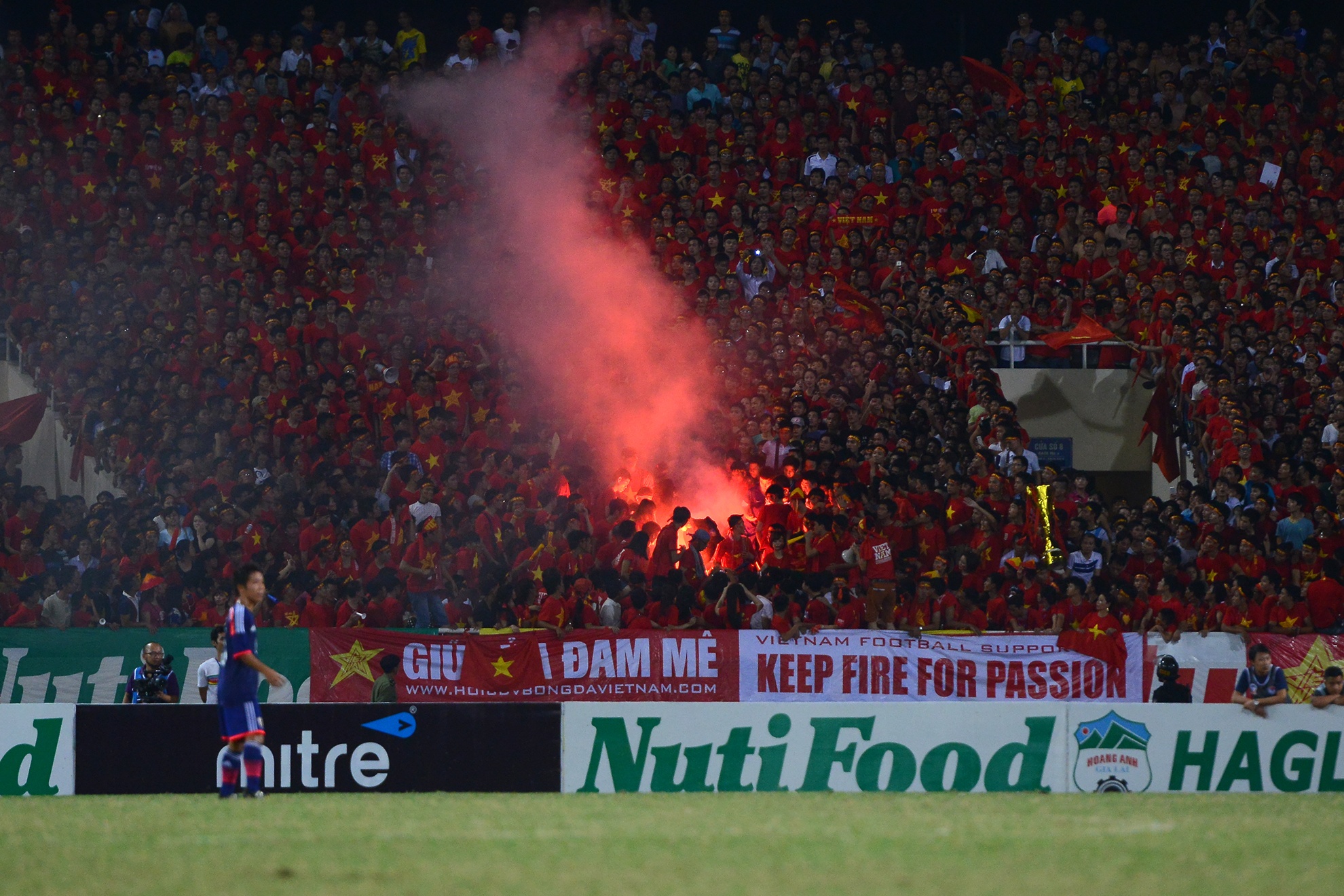 | Sân vận động Mỹ Đình được phủ kín bởi màu đỏ của 40 nghìn CĐV. Đây là nguồn khích lệ vô cùng to lớn đối với đội quân của HLV Graechen. |