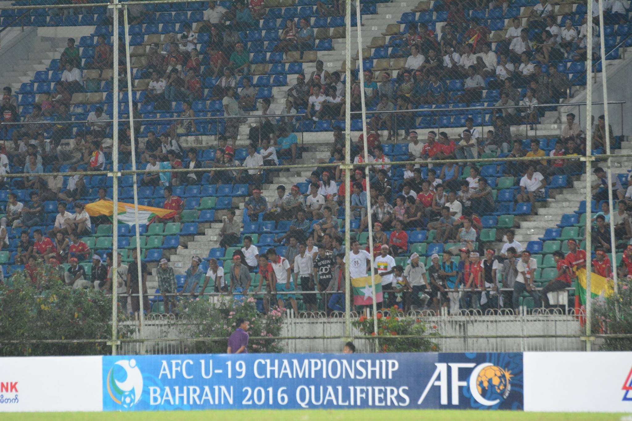 | Khán giả Myanmar đến sân sớm theo dõi hiệp 2 trận đấu U19 Việt Nam - U19 Đông Timor và chờ cổ vũ đội nhà thi đấu. Ở cuộc so tài ngay sau đó, U19 Myanmar đã giành chiến thắng 2-1 trước U19 Hong Kong, nhằm tiếp tục nuôi hy vọng cạnh tranh tấm vé dự Vòng chung kết U19 châu Á 2016 tại Bahrain với U19 Việt Nam. 2 cầu thủ lập công cho U19 Myanmar là Aung Zin Phyo và Aung Moe Thu. |