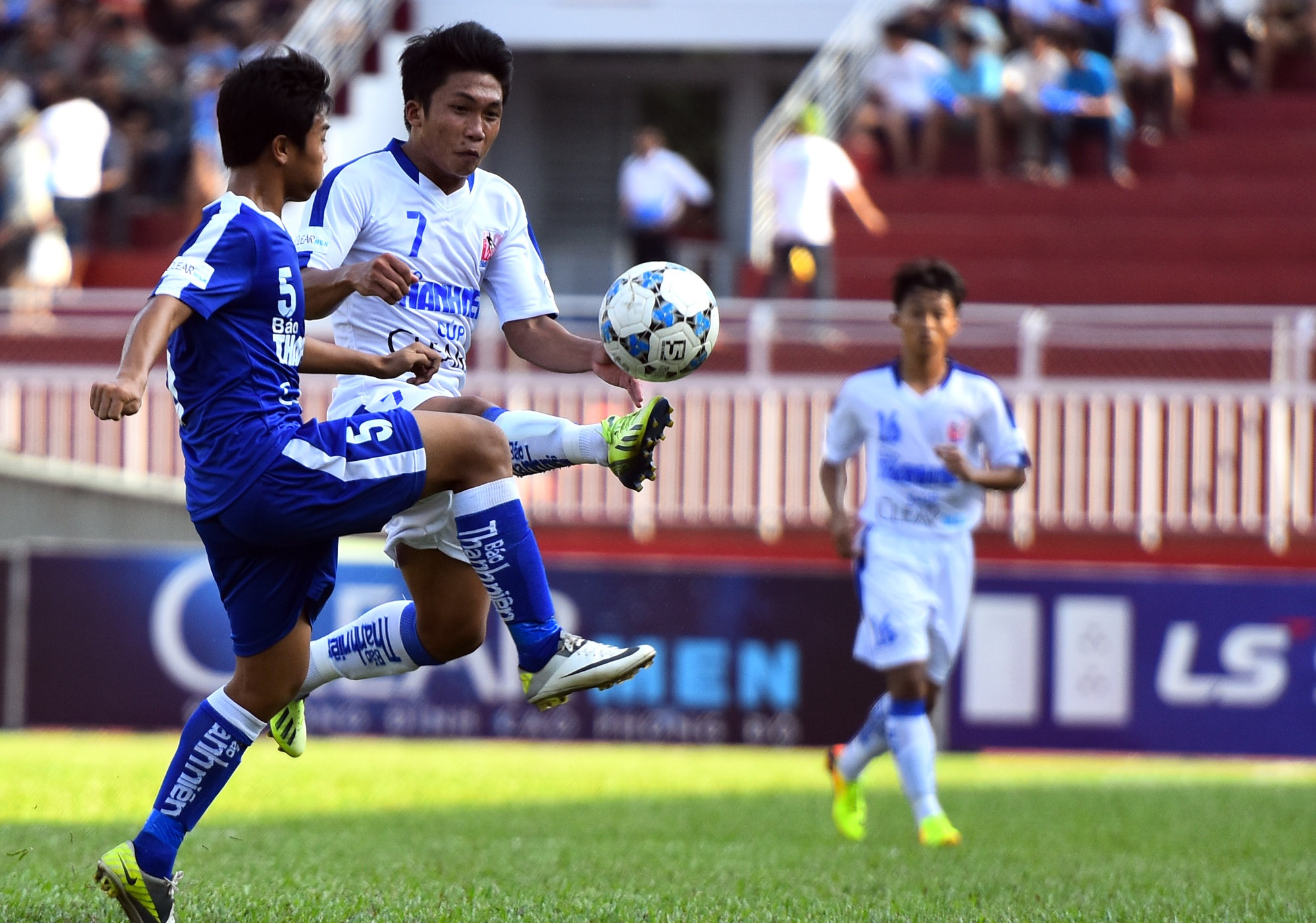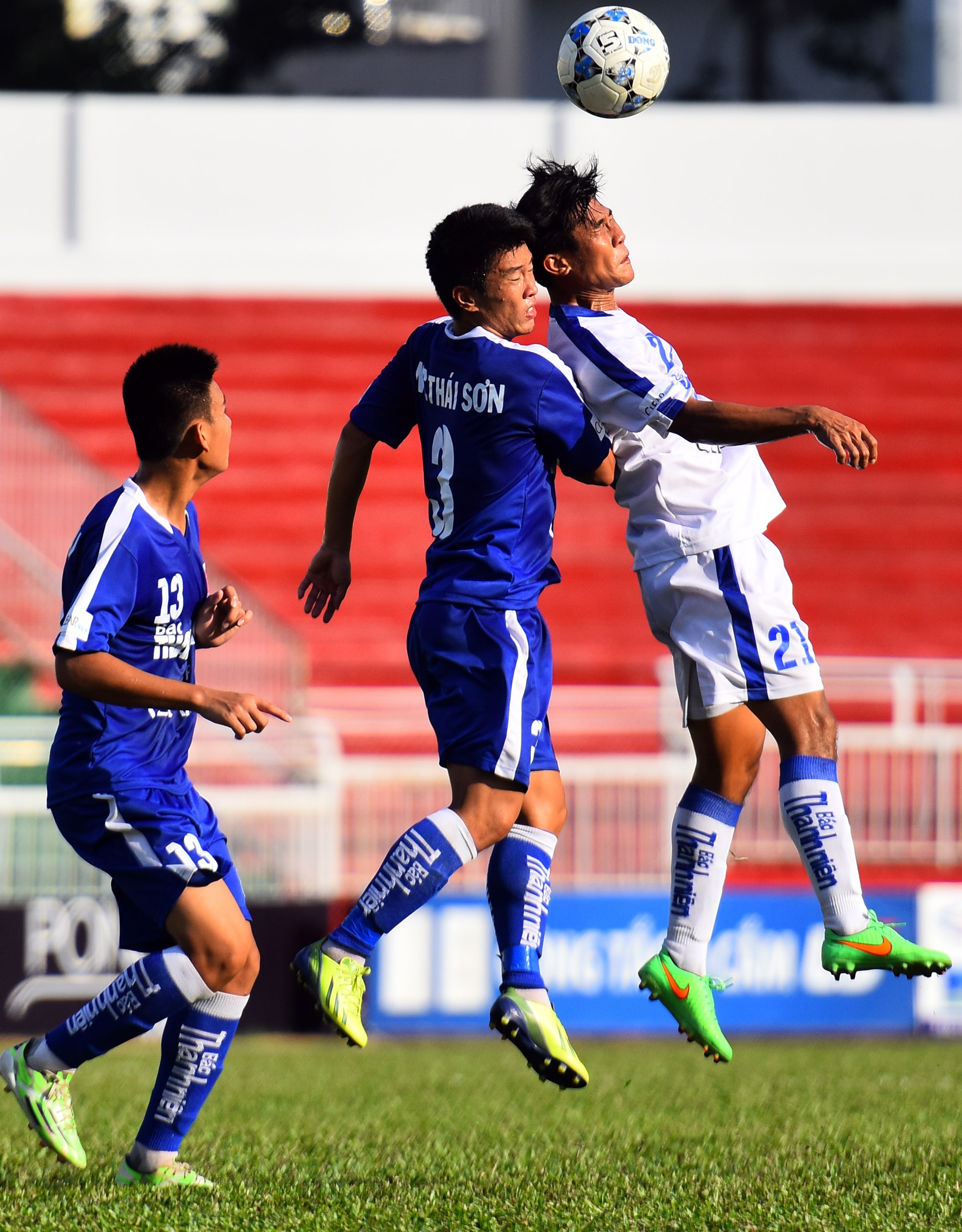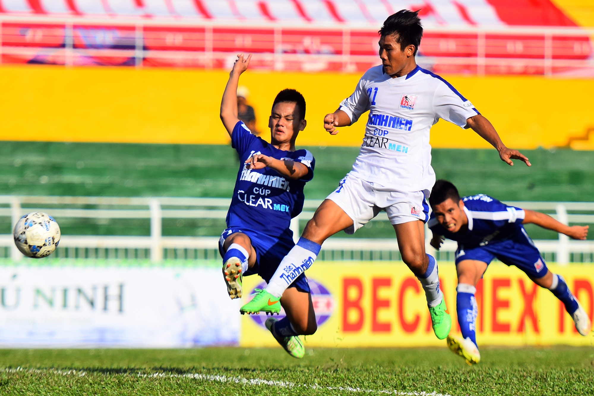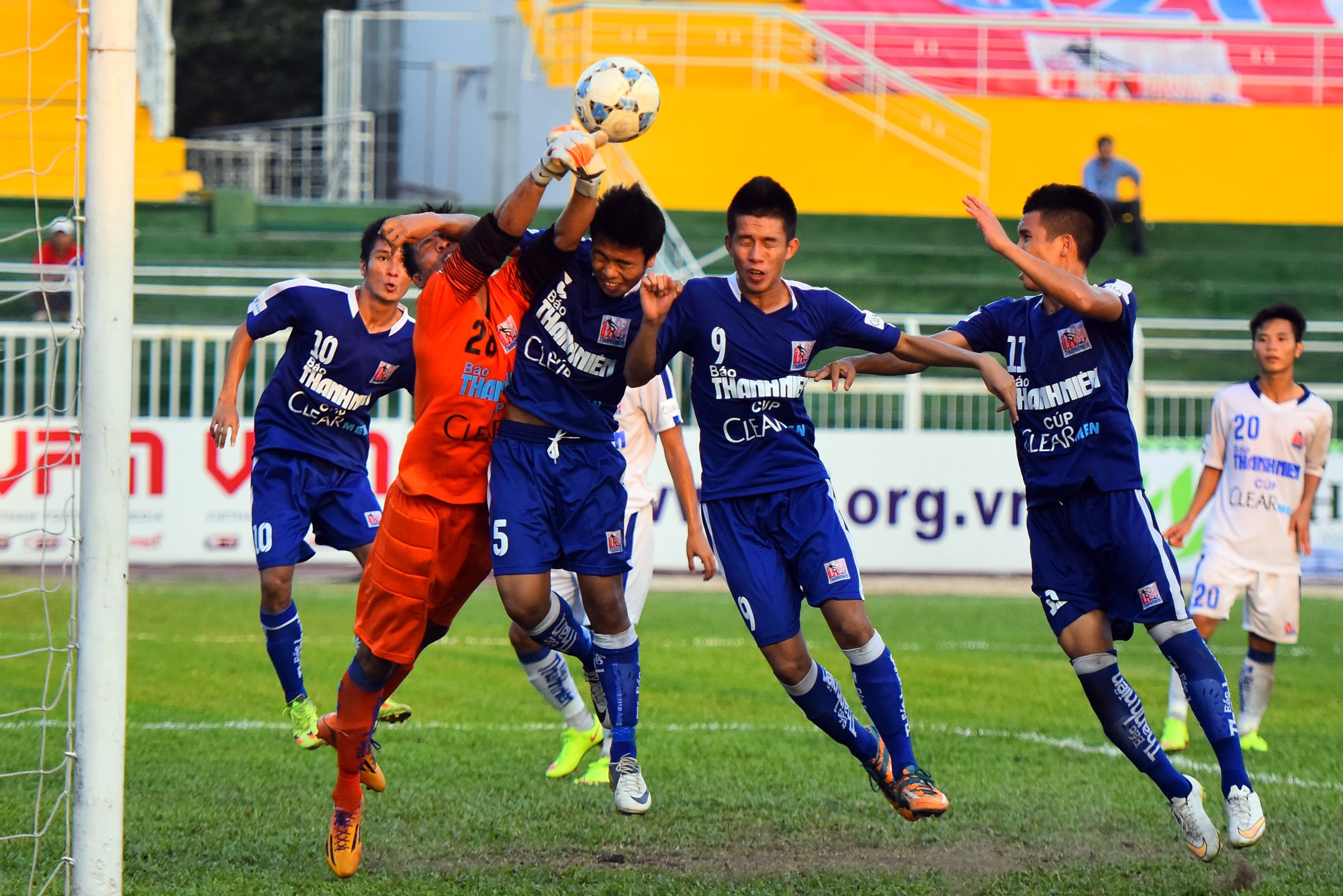 | Thể hình quá nhỏ con khiến những pha tạt bóng từ hai biên của U21 Bình Định đều bị các hậu vệ áo trắng cản phá. |