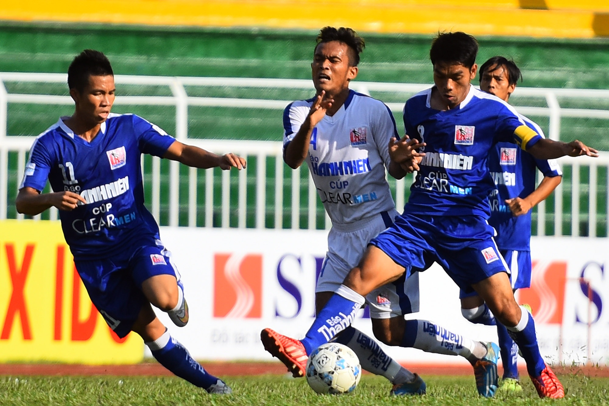 | Văn Nhớ của U21 Bình Định trong vòng vây của các hậu vệ U21 An Giang, những pha phối hợp của đội bóng đất võ đều bị chặn lại từ khu vực giữa sân. |
