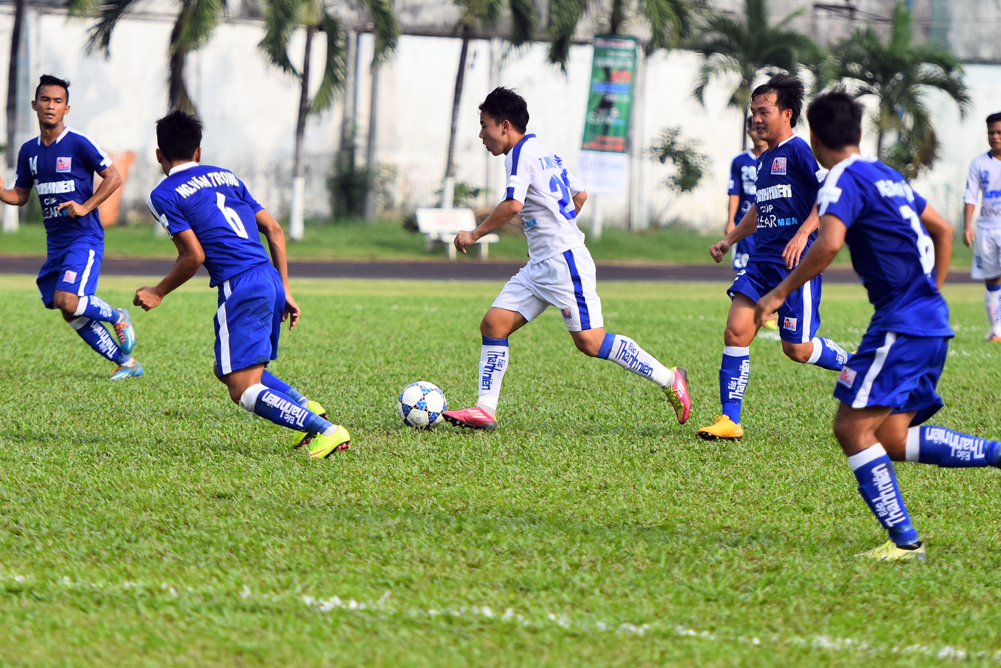 | Các pha đi bóng của anh đều bị hậu vệ U21 An Giang chặn đứng từ khu vực giữa sân. |