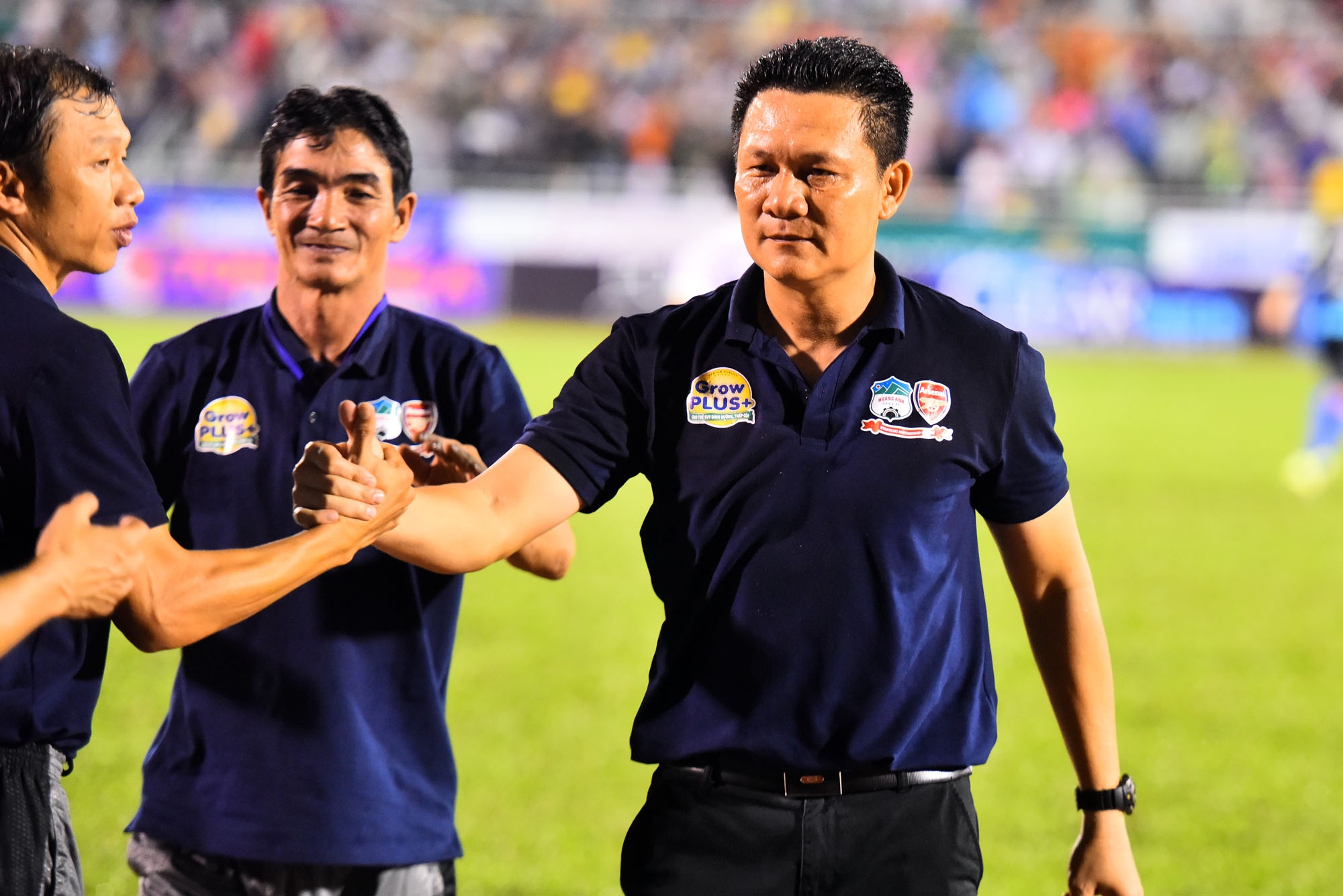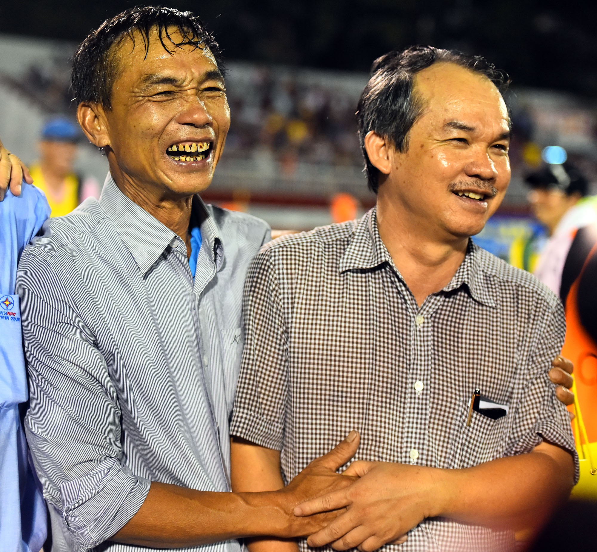 | Trong khi đó, HLV trưởng U21 HAGL, ông Nguyễn Quốc Tuấn lạnh lùng chung vui cùng các trợ lý. |