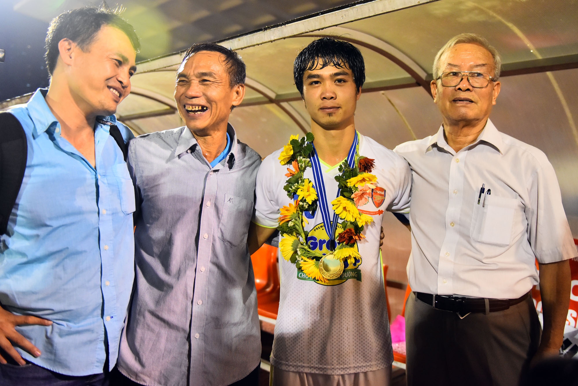 | Tiền đạo xứ Nghệ có tấm ảnh chung với cha và HLV Nguyễn Văn Vinh. |