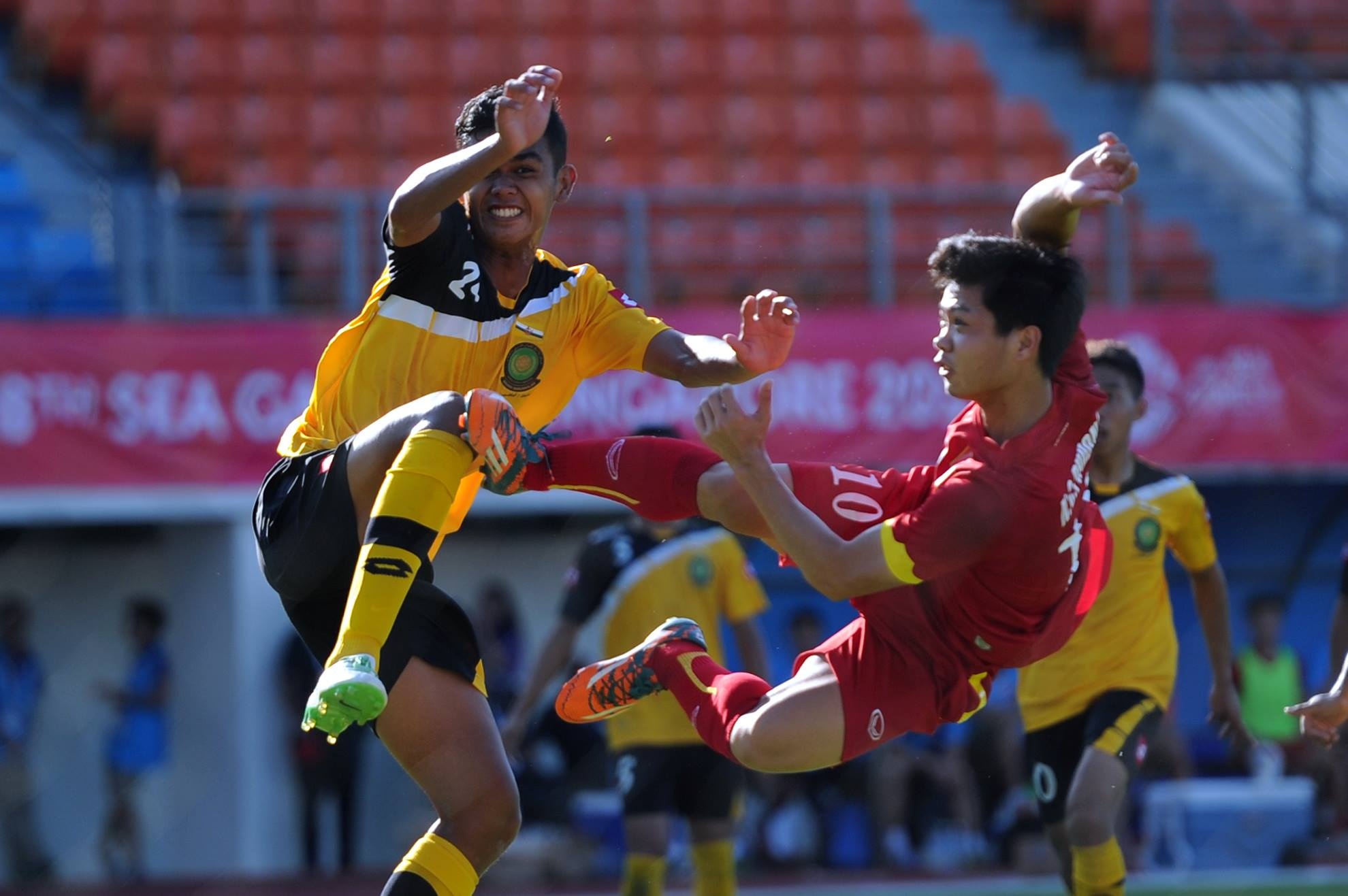 Các cầu thủ U23 Brunei theo rất sát U23 Việt Nam. Ảnh: Anh Tuấn.