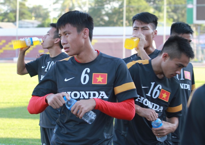 | Ở Myanmar thời tiết khá nóng nên các cầu thủ liên tục phải tiếp nước. HLV Hoàng Văn Phúc cho biết rất may là U23 Việt Nam sang Myanmar sớm nên sẽ thích ứng tốt với điều kiện khí hậu trước khi chính thức bước vào hành trình chinh phục tấm HCV SEA Games 27. |