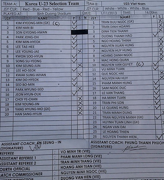 U23 Việt Nam: Nguyên Mạnh, Vũ Minh Tuấn, Thanh Hào, Mạnh Hùng, Quang Hùng, Văn Quyết, Thanh Hiền, Ngọc Đức, Văn Thắng, Phi Sơn, Hà Minh Tuấn.