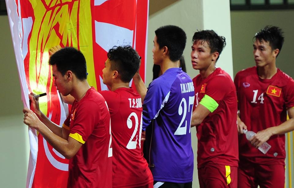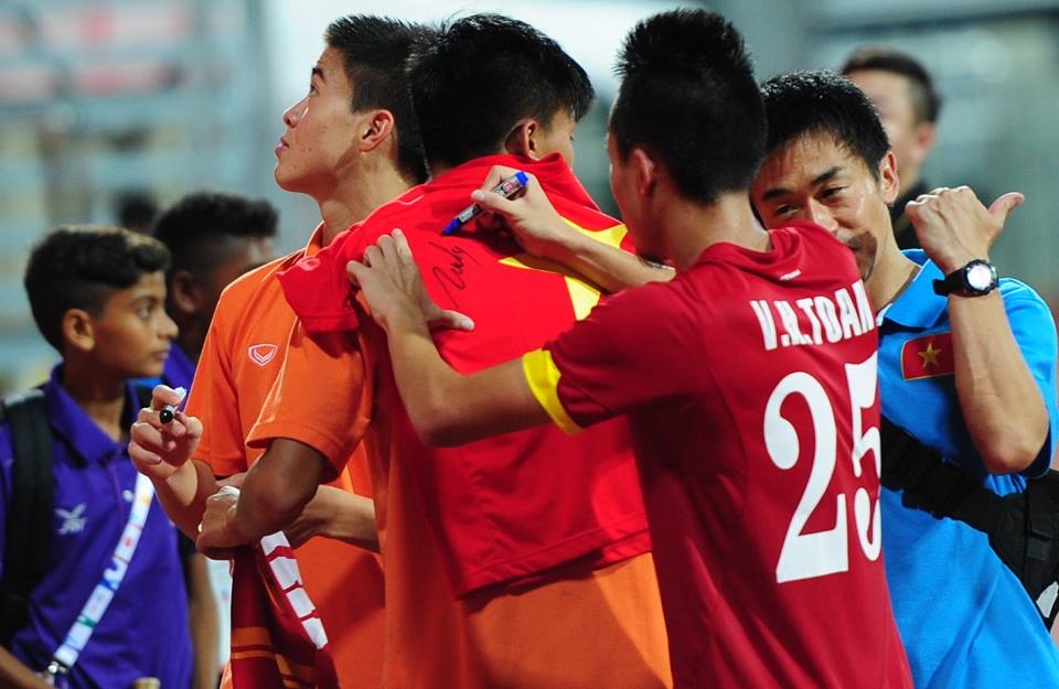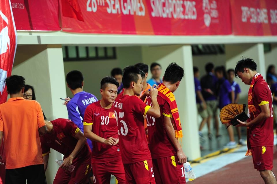 Sau trận thắng U23 Đông Timor 4-0 để giành quyền vào bán kết, các cầu thủ U23 Việt Nam đã ở lại sân Bishan để cảm ơn và ký tặng người hâm mộ.