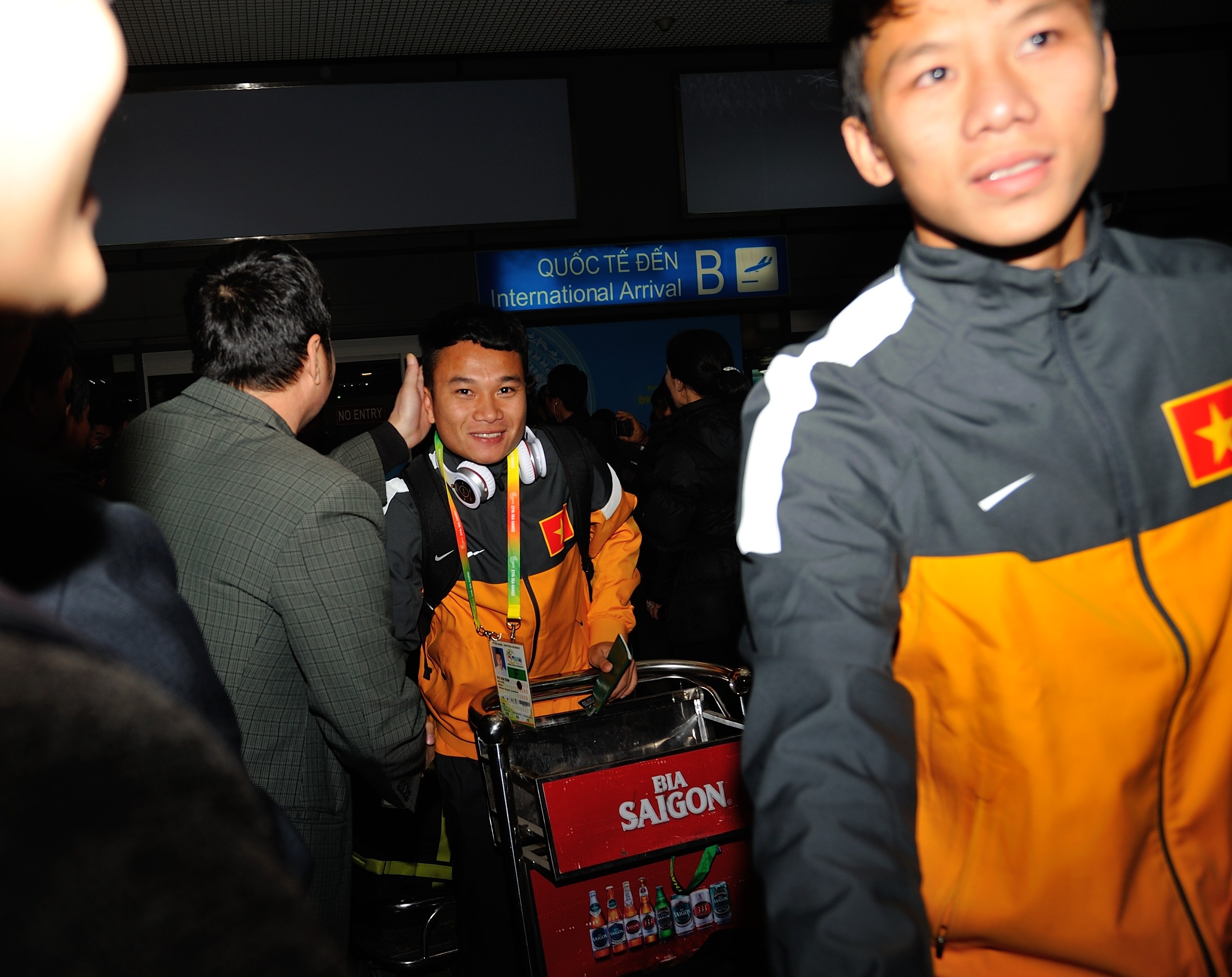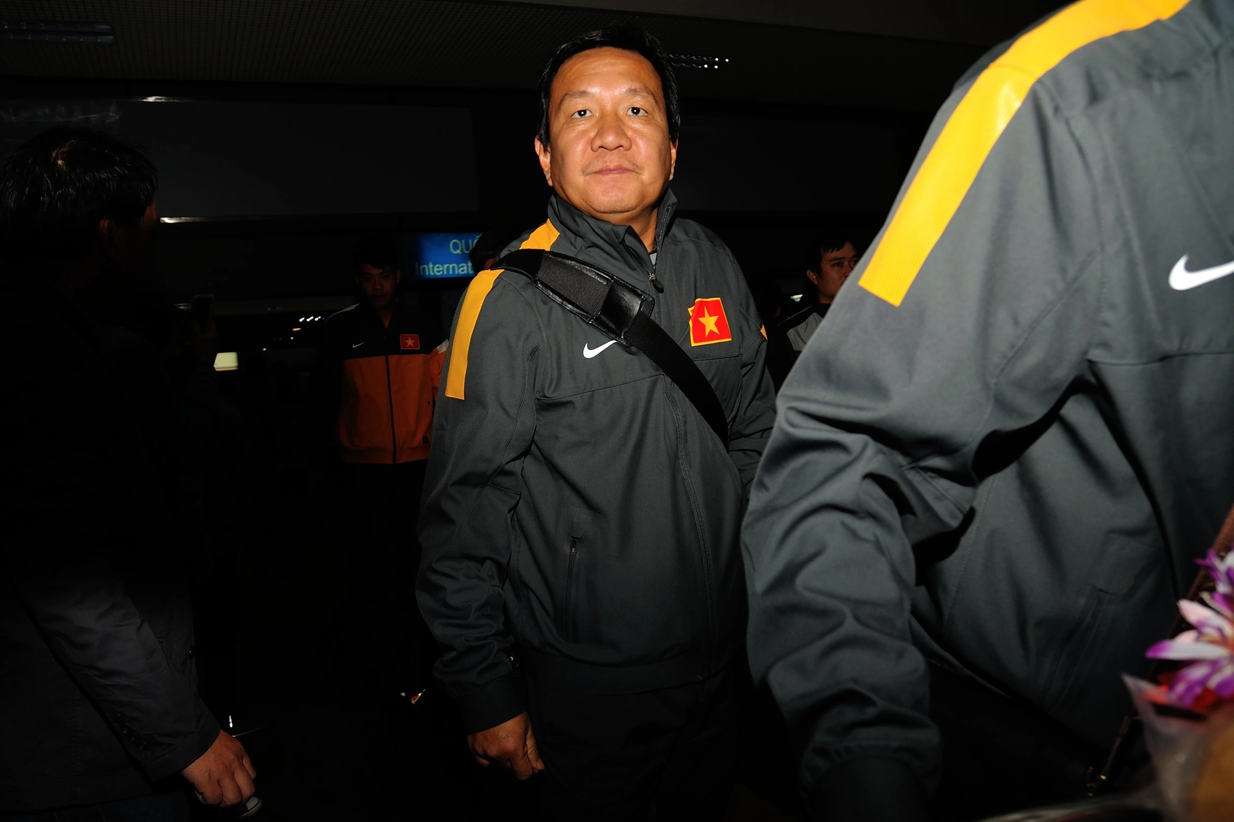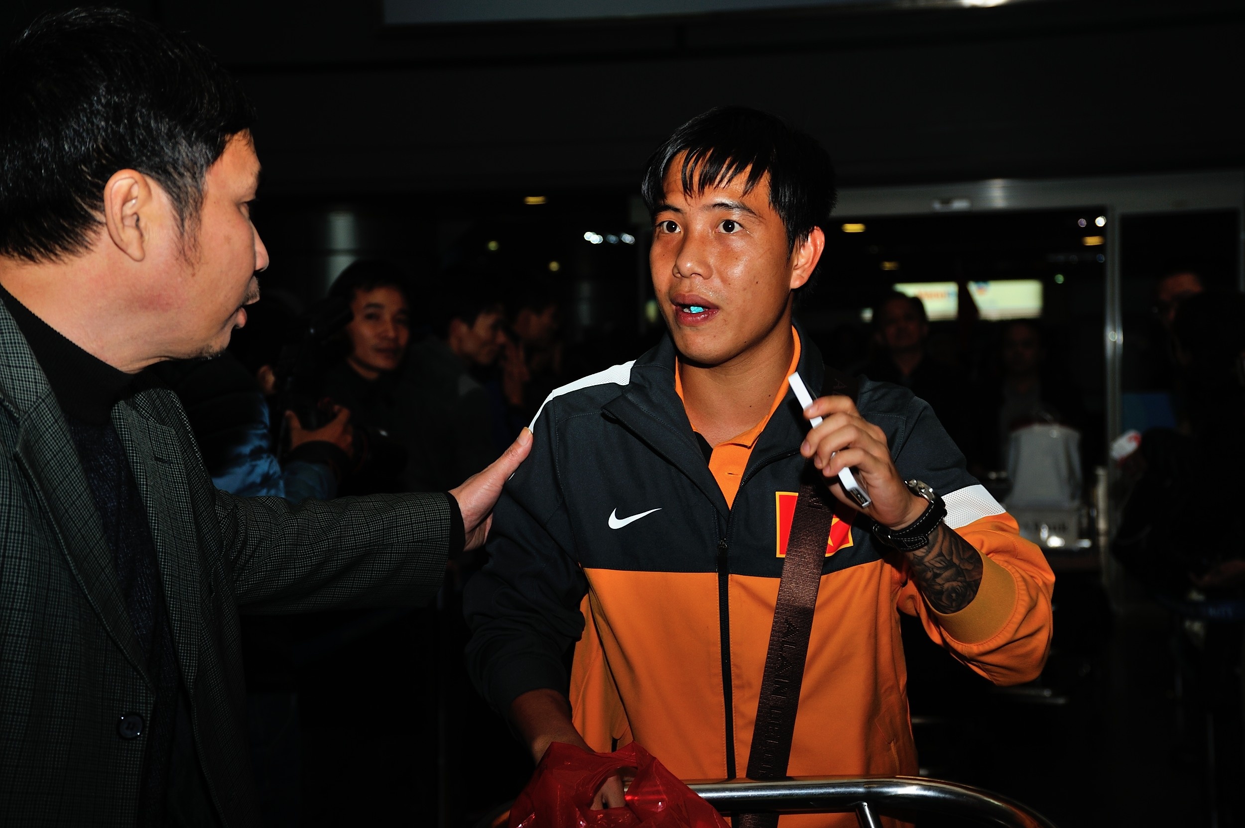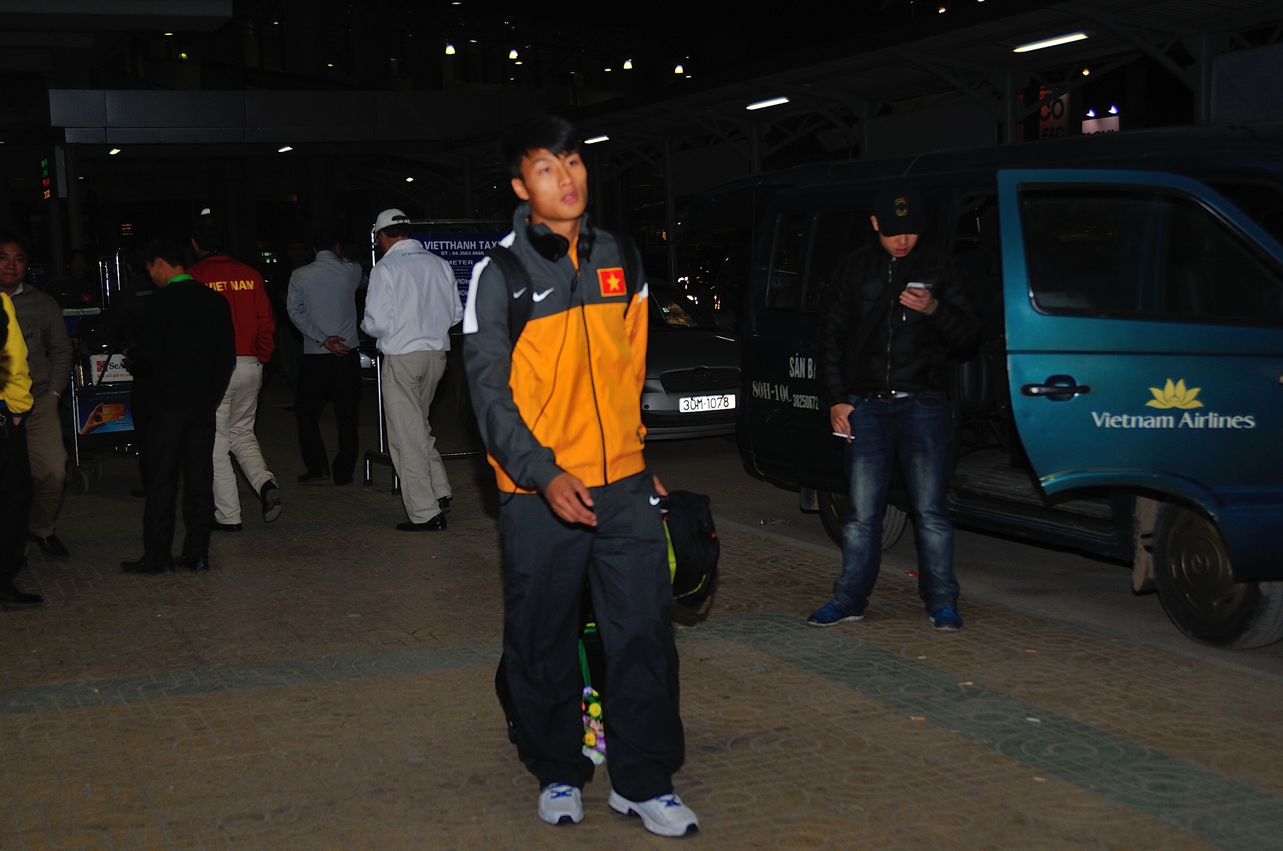 | HLV Hoàng Văn Phúc không dẫn đầu cả đội U23 ra khỏi sân bay như mọi khi. |