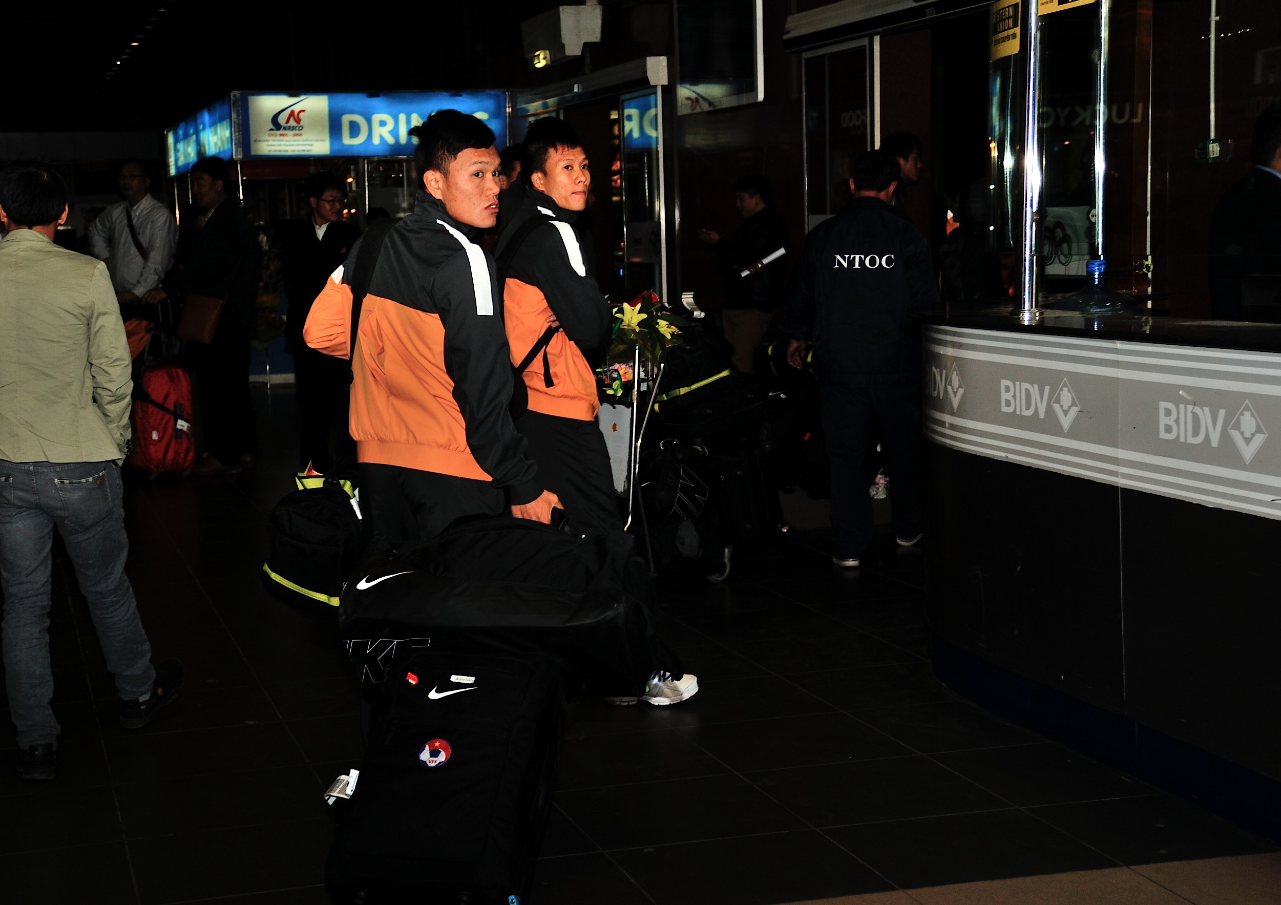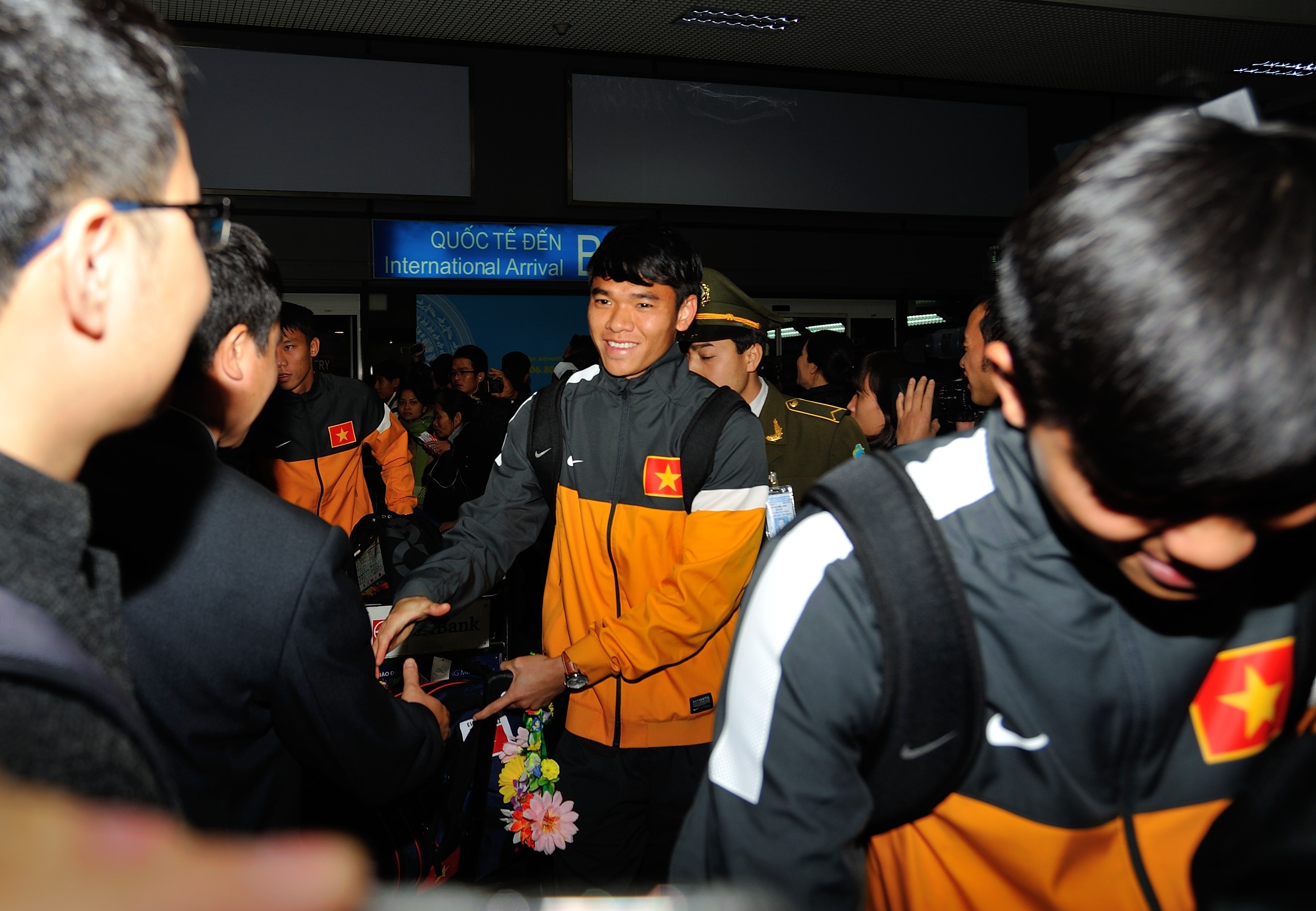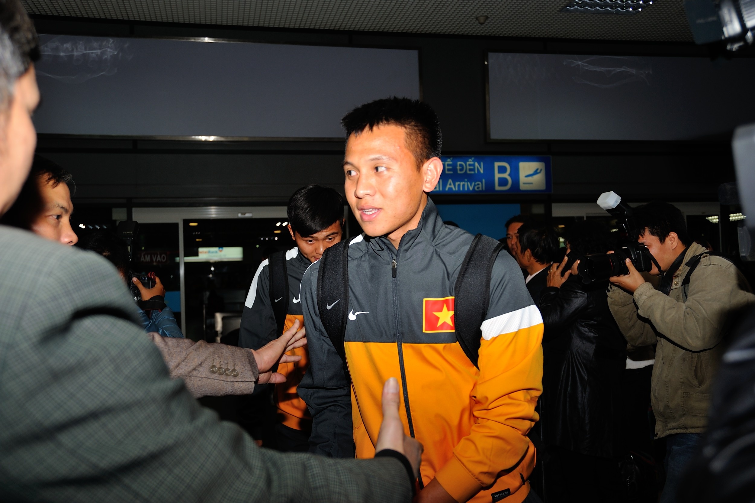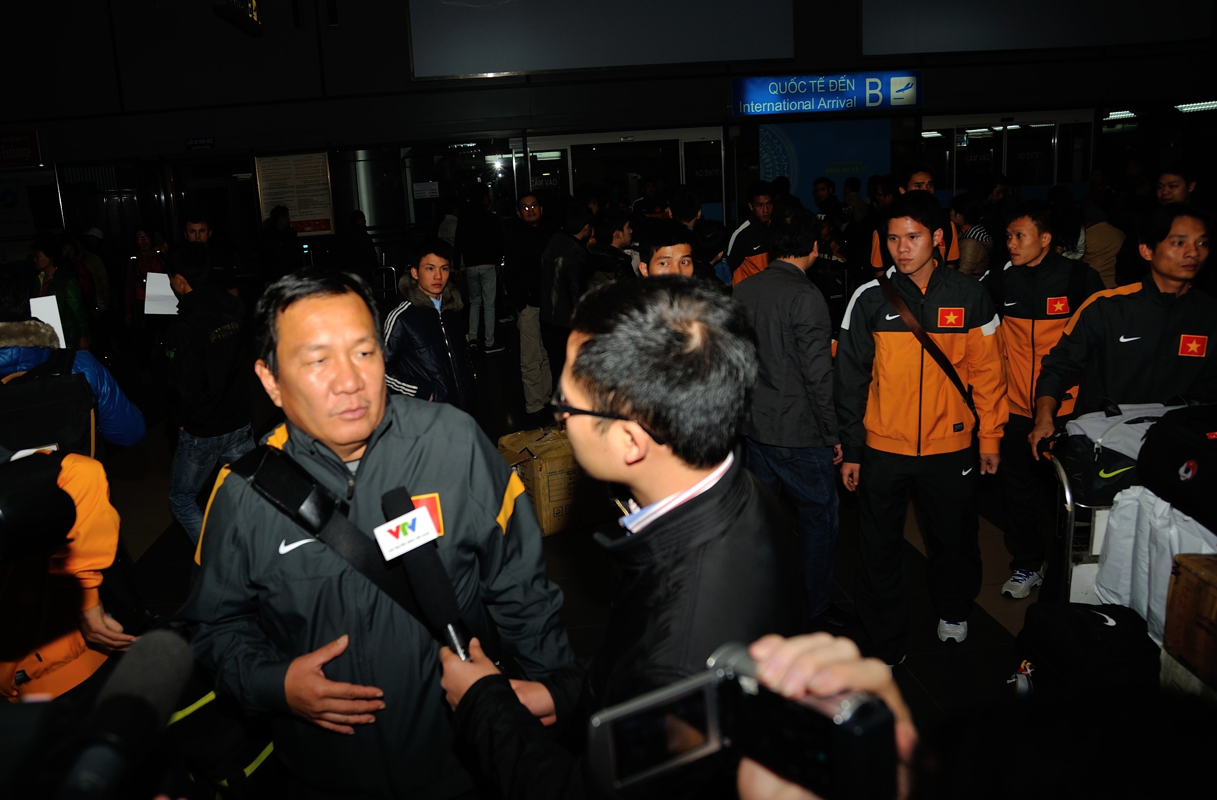 | HLV Hoàng Văn Phúc không dẫn đầu cả đội U23 ra khỏi sân bay như mọi khi. |