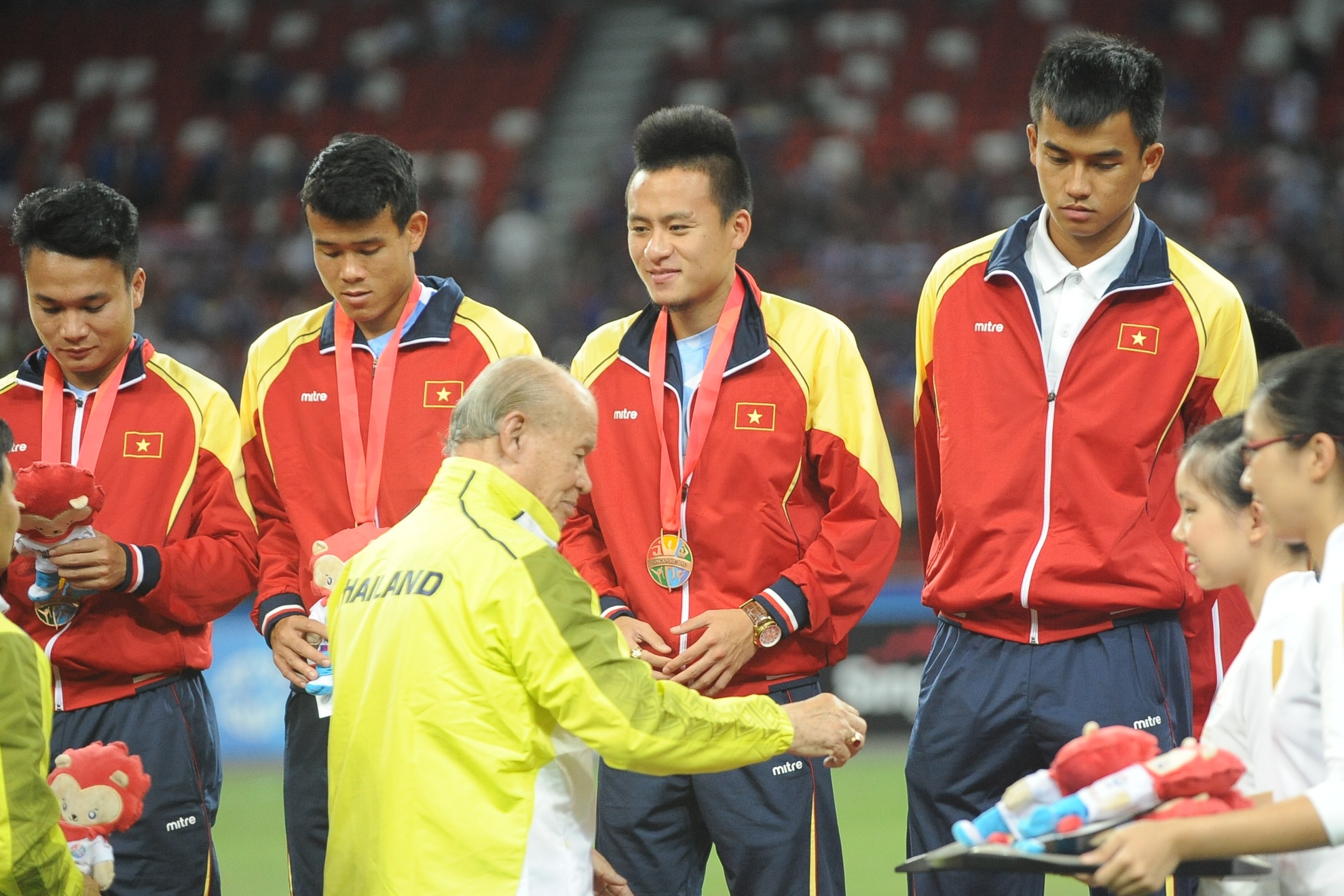 | Đại diện Liên đoàn bóng đá Thái Lan - đội bóng giành HCV trao huy chương đồng cho các cầu thủ U23 Việt Nam. |