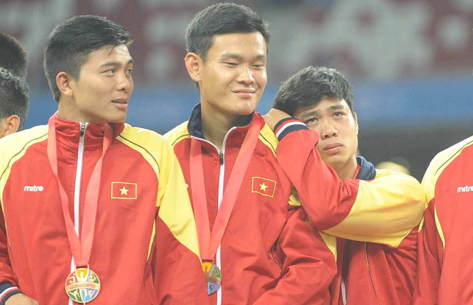 | Công Phượng trầm ngâm trên bục nhận huy chương. Anh không hài lòng với màn trình diễn của mình trong kỳ SEA Games đầu tiên. Phượng ghi 3 bàn thắng ở giải lần này. |