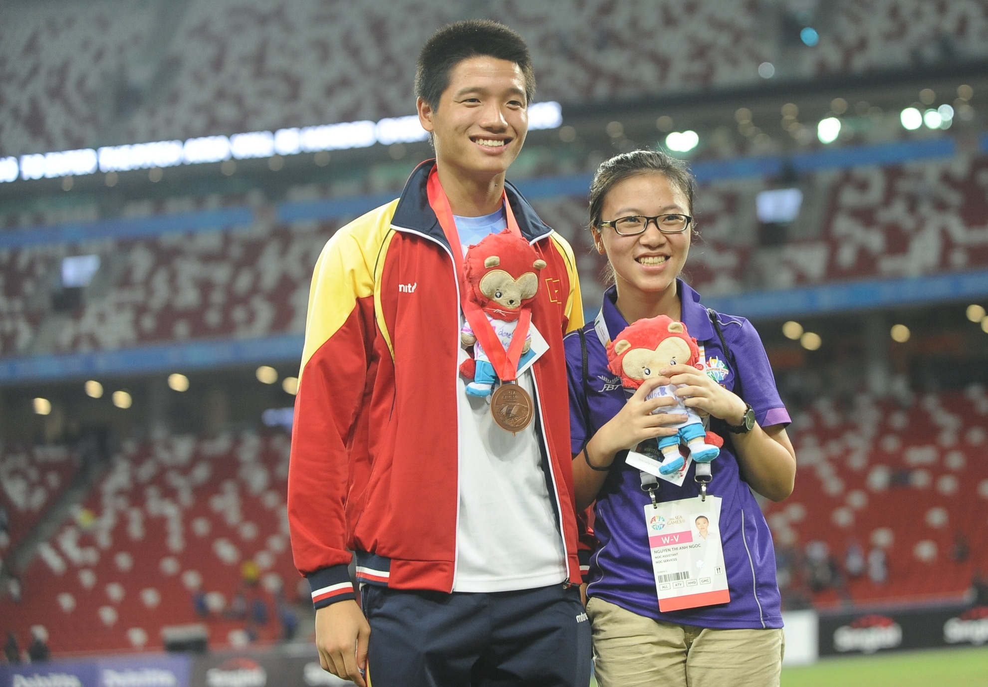 | Thủ môn Phí Minh Long và tình nguyên viên Nguyễn Ánh Ngọc (phải). Cô tình nguyện viên đã theo đội U23 Việt Nam suốt vòng bảng cho tới trận đấu cuối cùng tại SEA Games 28. |