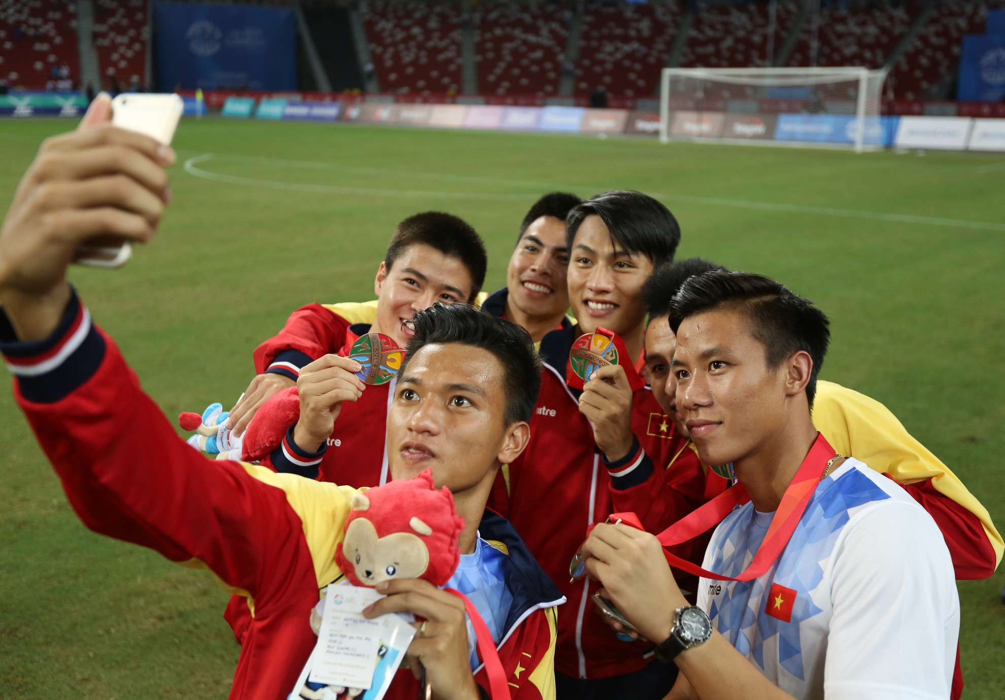 | Các cầu thủ U23 Việt Nam cùng nhau lưu lại khoảnh khắc nhận huy chương đồng, trước khi chia tay SEA Games 28. |