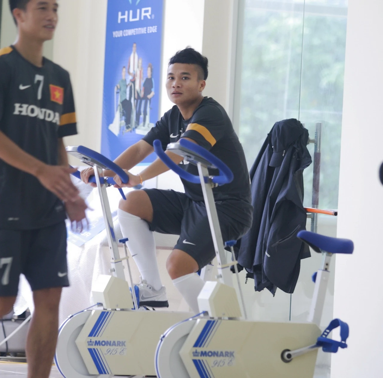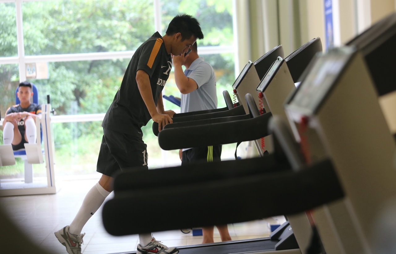 | Đội trưởng Văn Quyết cũng tranh thủ tập với máy chạy bộ trong thời gian giải lao. |