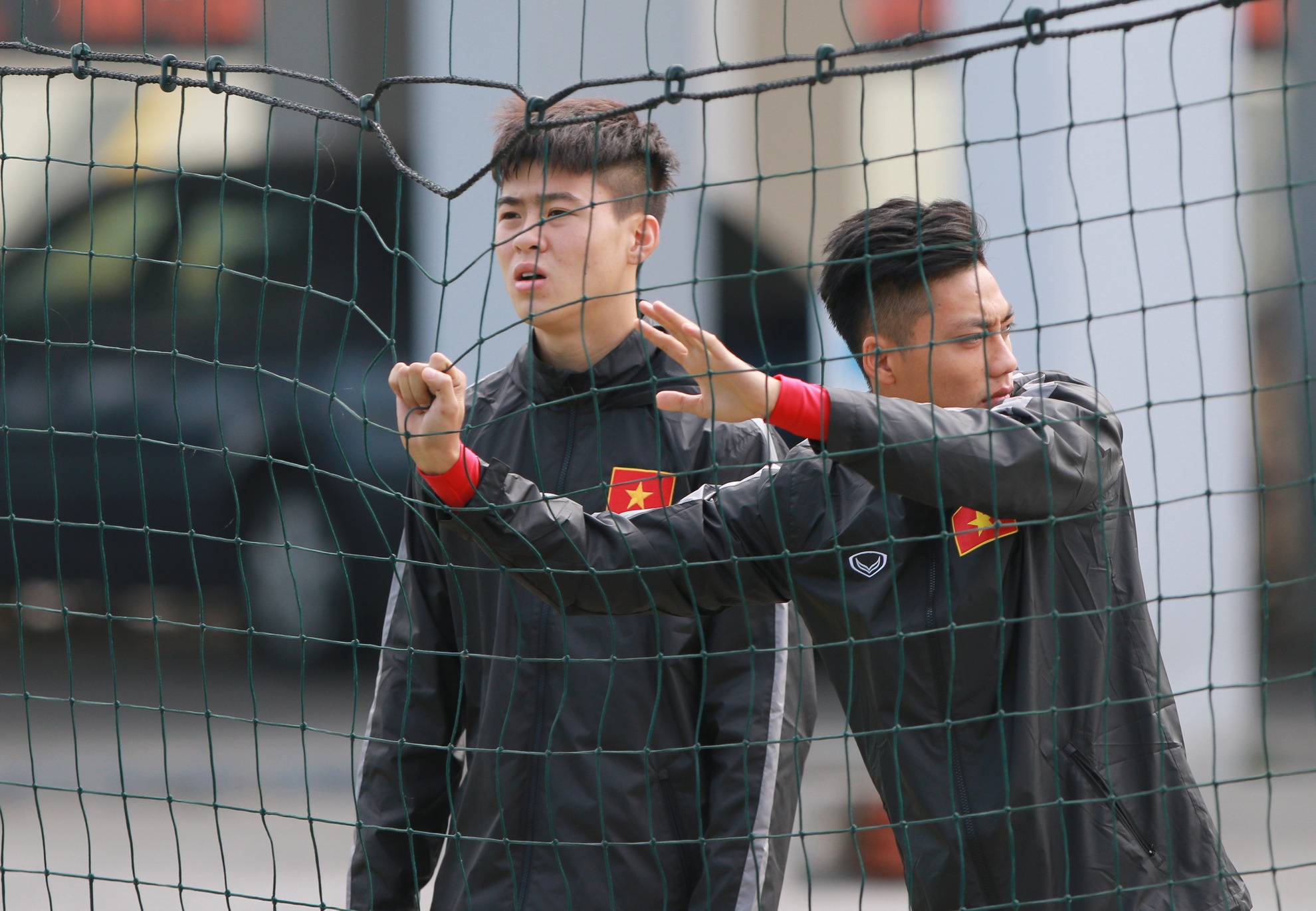 | Nhóm cầu thủ chấn thương gồm Duy Mạnh, Lâm Ti Phông, Ngọc Thắng, Văn Dũng... đứng ngoài lưới chắn theo dõi các đồng đội tập luyện. |