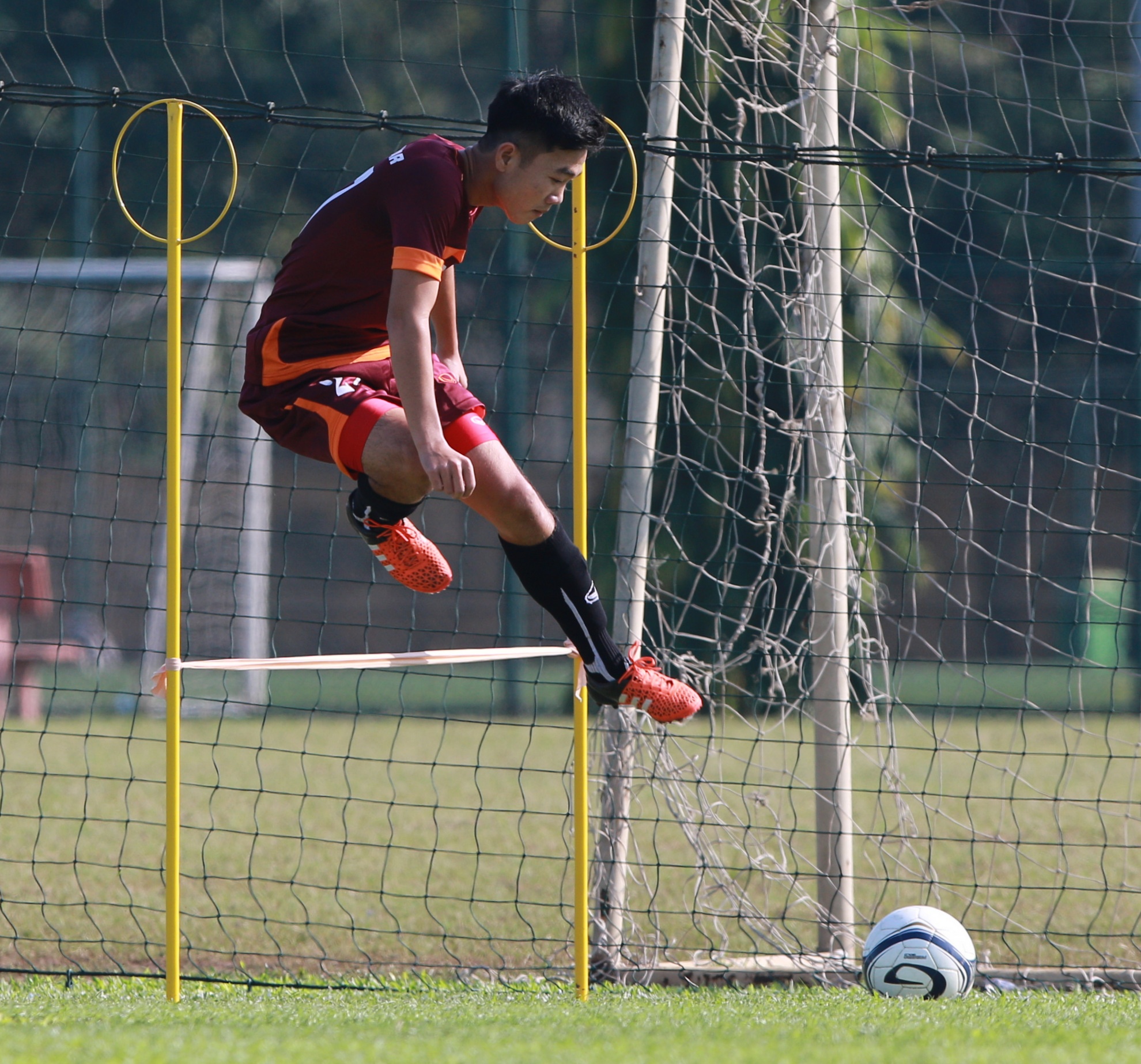 | Trọng Đại, đội trưởng U19 Việt Nam thực hiện động tác khéo léo để khống chế bóng qua chướng ngại vật. |