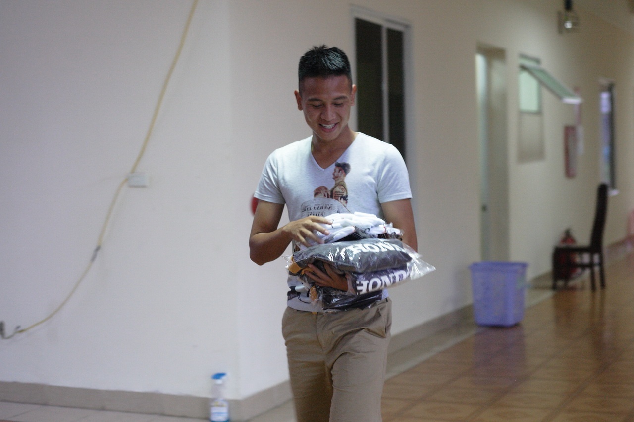 | Ngay sau khi hội quân đầy đủ, BHL đã tổ chức phát trang phục mới cho các cầu thủ. |