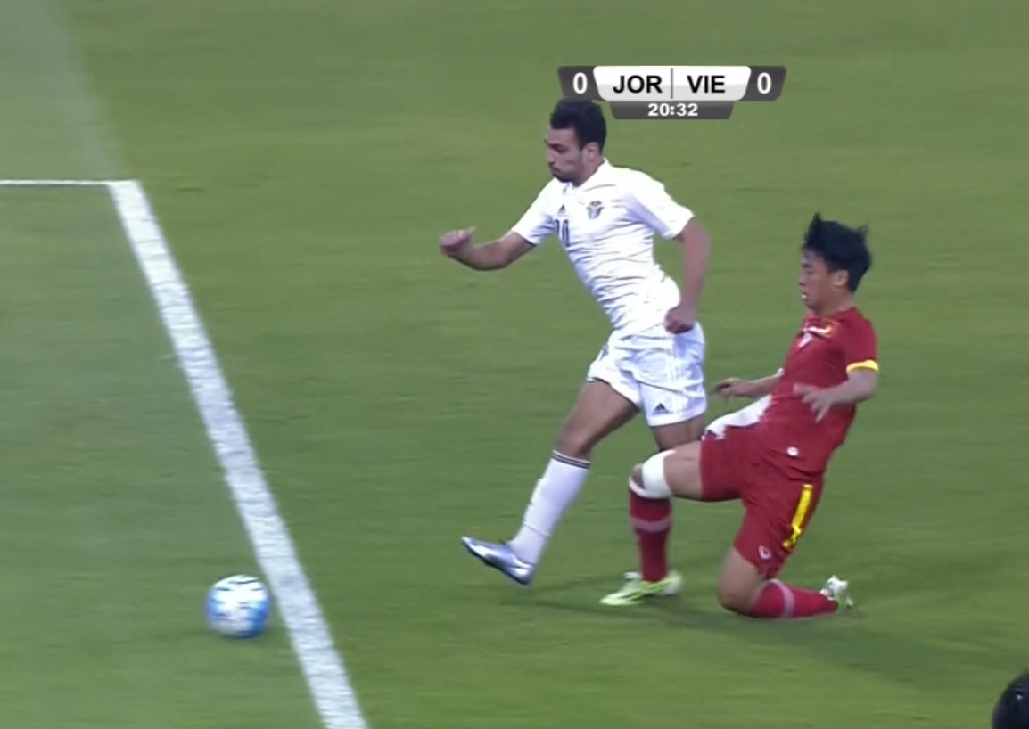 15': Bùi Tiến Dũng nhận thẻ vàng sau pha vào bóng nguy hiểm. U23 Jordan được hưởng quả đá phạt nguy hiểm ở khoảng cách chừng 20 m.
