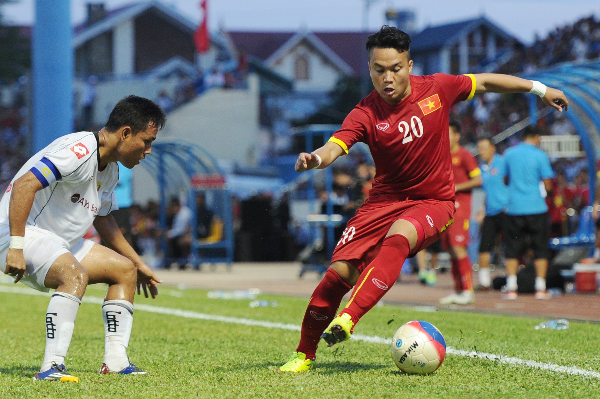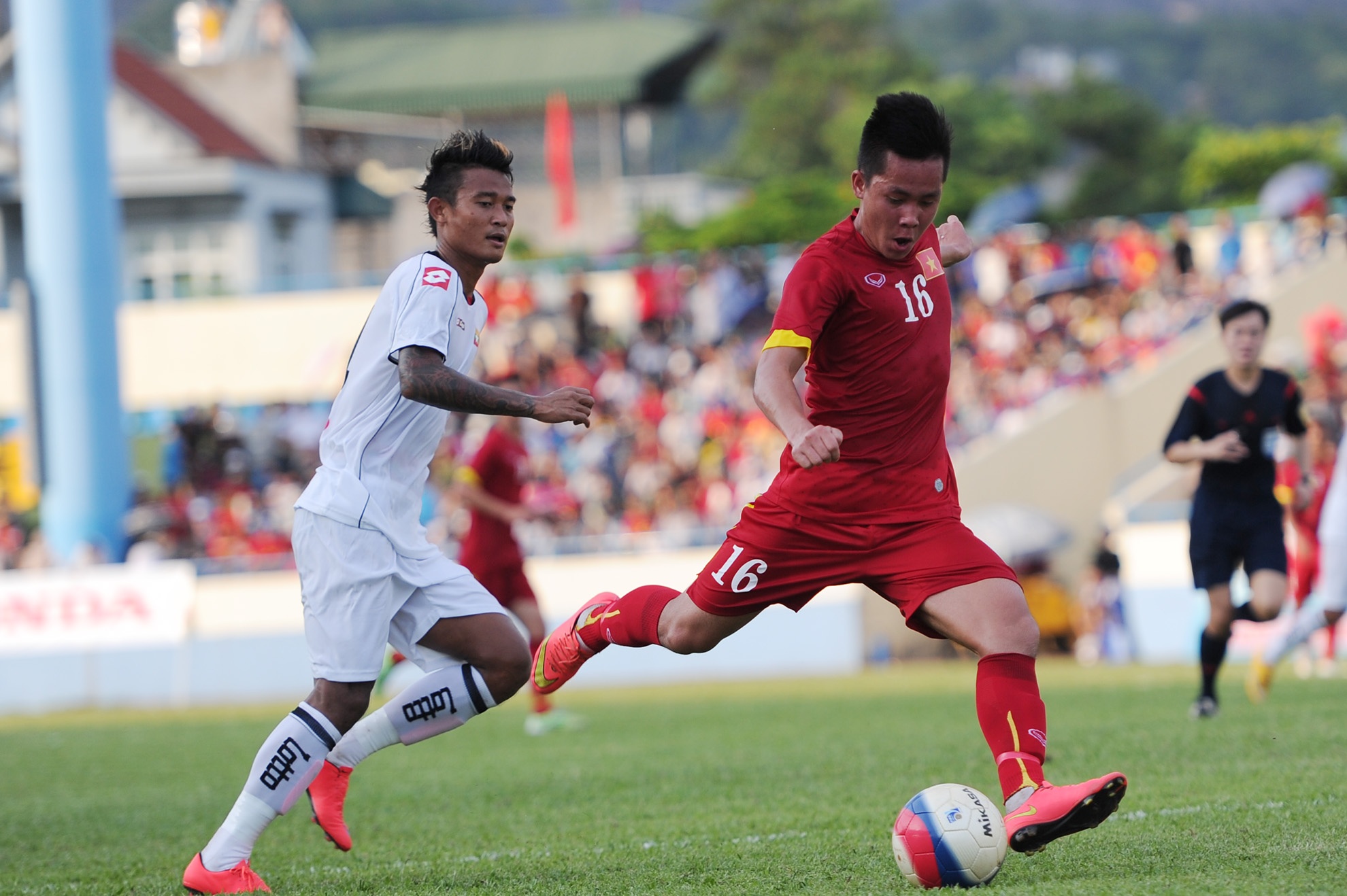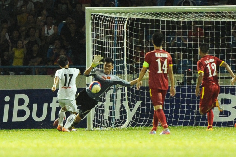| Tiền đạo thuộc biên chế HAGL ghi bàn mở tỷ số trận đấu ở phút 22. Anh dùng tốc độ và kỹ thuật loại bỏ ba cầu thủ đội khách trước khi đánh bại thủ môn Kyaw Zin Phyo bằng cú sút hiểm hóc. |