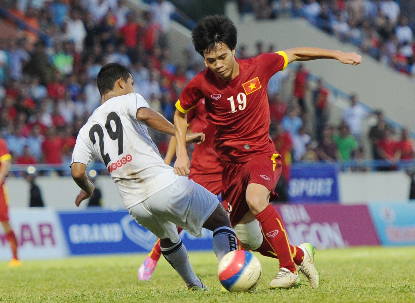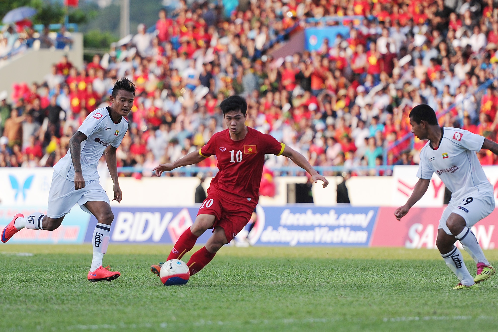 | Công Phượng là tâm điểm trên sân khi nhận được sự chú ý của hậu vệ Myanmar. Tiền đạo số 10 của U23 Việt Nam nhận những pha vào bóng quyết liệt của cầu thủ đối phương. |