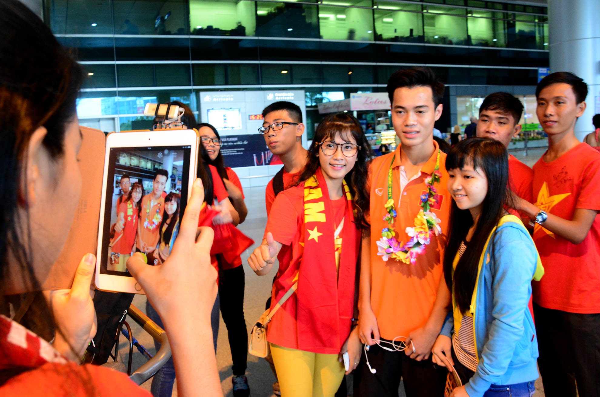 | Ra đến sảnh sân bay, Mạnh Hùng chụp ảnh với người hâm mộ và điện báo cho người thân. Tại SEA Games 28, Hùng "xà ngang" có ít cơ hội thể hiện sở trường đá phạt. |